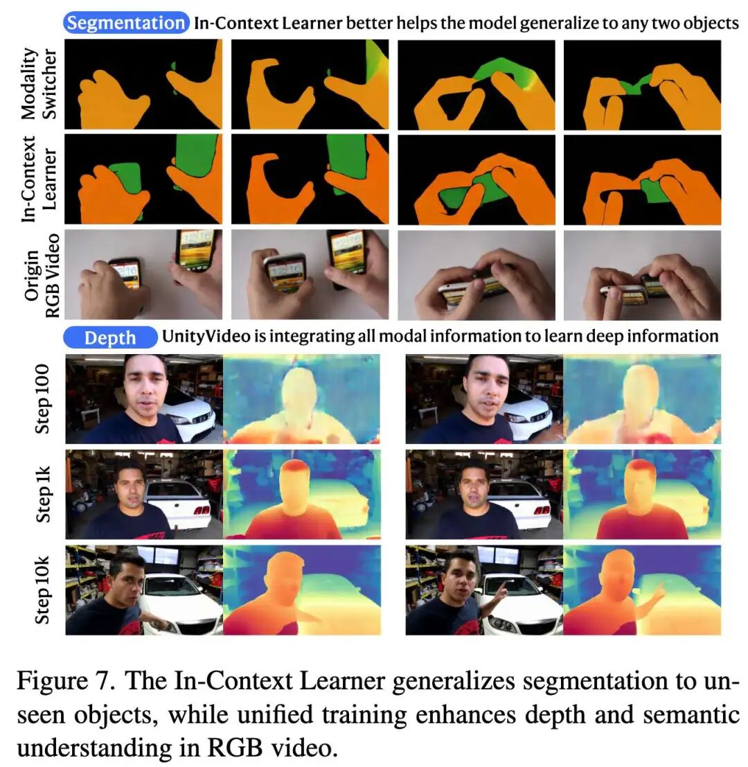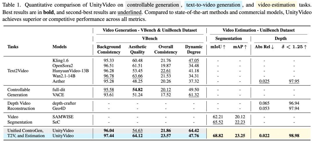 UnityVideo,这是一个在单一 Diffusion Transformer 中对多种视觉模态和任务进行建模的统一框架。通过利用模态自适应学习,UnityVideo 实现了 RGB 视频与辅助模态(深度、光流、分割、骨骼和 DensePose)之间的双向学习,从而在两类任务上都实现了相互增强。本文的实验展示了其在不同基准上的最先进性能,以及对未见模态组合的强大零样本泛化能力。为了支持这项研究,本文贡献了 OpenUni,这是一个包含 130 万同步样本的大型多模态数据集,以及 UniBench,这是一个带有真值标注的高质量评估基准。UnityVideo 为统一多模态建模铺平了道路,是迈向下一代世界模型的重要一步。