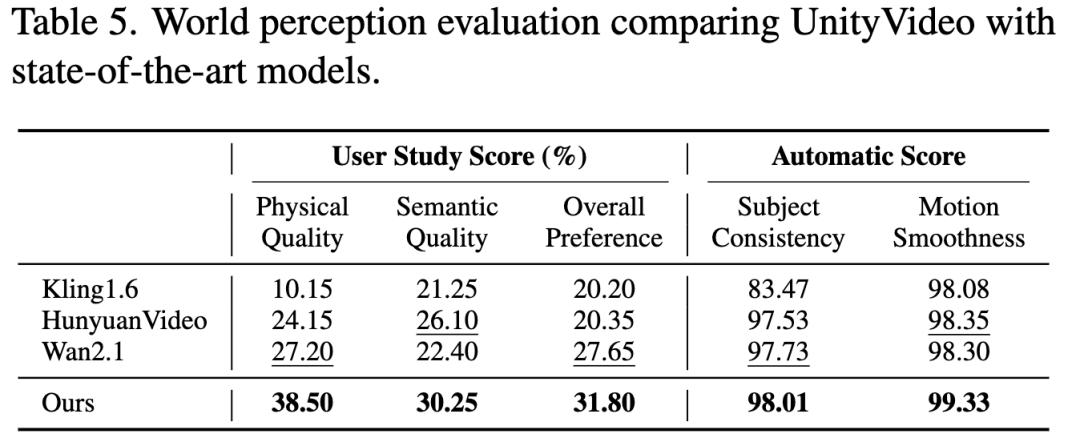 图5。与不同任务中SOTA方法的比较。UnityVideo展现出更优越的物理推理能力,更好地遵守控制条件,并对辅助模态有更深入的理解。