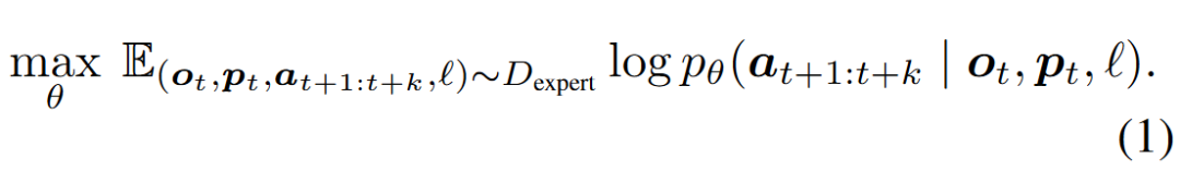 本工作考虑语言条件下的机器人操作任务。对于每个具身智能体,任务定义了动作 、观测 (视觉输入)、语言指令 以及机器人的本体感知 ,其中 分别表示动作空间、观测空间和语言指令空间。任务通常提供一个专家数据集 ,其中包含专家在 个时间步内收集的机器人本体感知、视觉观测和动作,以及每条轨迹对应的语言标注。本工作在 上训练一个由 参数化的策略。在每个时间步 ,策略基于当前的观测和本体感知预测接下来的 个动作(即动作分块 action chunking),对分布 或 进行建模。策略 的训练目标是最大化似然目标: