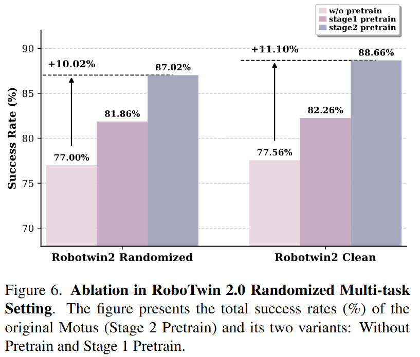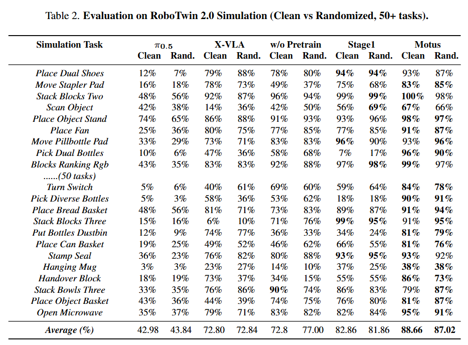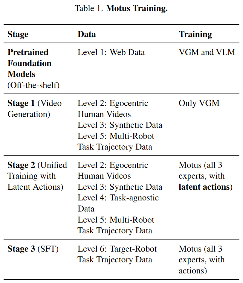 Motus 训练。Motus 分三个结构化阶段进行训练(表 1),逐步将来自不同数据集的物理交互先验整合到可迁移至目标机器人的策略中。每个阶段解决一个关键挑战: