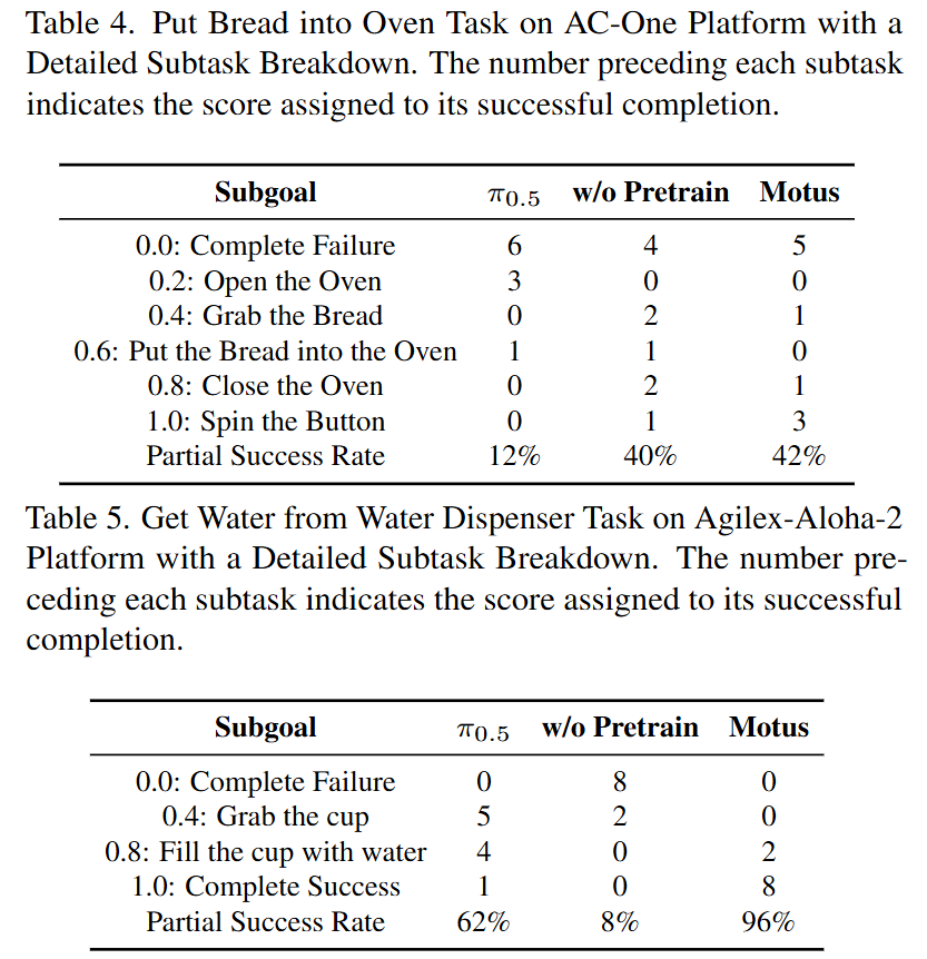 局限性:尽管结果很有希望,但 Motus 需要大量的计算资源进行训练和推理,这可能会限制其实时应用。此外,虽然潜在动作弥补了视觉和控制之间的差距,但在极其精细的操作任务中,其保真度可能仍不如直接的高频本体感知控制。未来的工作将集中在优化推理效率和探索更高保真度的潜在动作表示上。