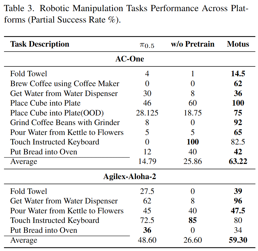 Motus,这是一个统一的潜在动作世界模型,它将具身基础模型的主流能力集成到一个单一的生成框架中,即视觉-语言理解、视频生成、逆动力学、世界建模和视频-动作联合预测。通过 MoT 连接预训练专家,使用 UniDiffuser 风格的调度器协调多模态建模,并引入潜在动作作为像素级“Delta Action”和运动表示,Motus 有效地从大规模异构数据中学习,并继承了通用多模态先验和丰富的物理交互知识。在仿真和真实世界场景中的大量实验表明,统一建模所有功能和先验显著有利于下游机器人任务。