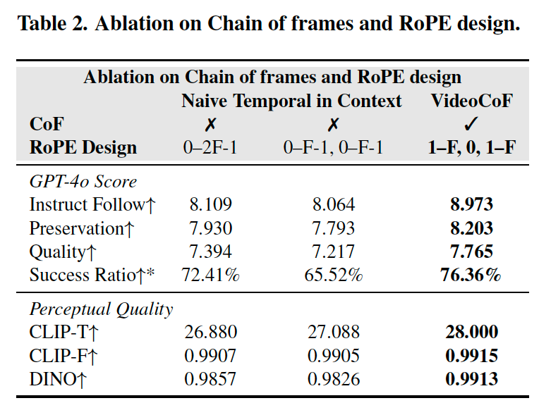 消融实验:图表与数据背后的真相 引入推理帧 (Reasoning Frames) 的核心增益 请看 Table 2 中 "Naive Temporal in Context" 与 "VideoCoF" 的对比: