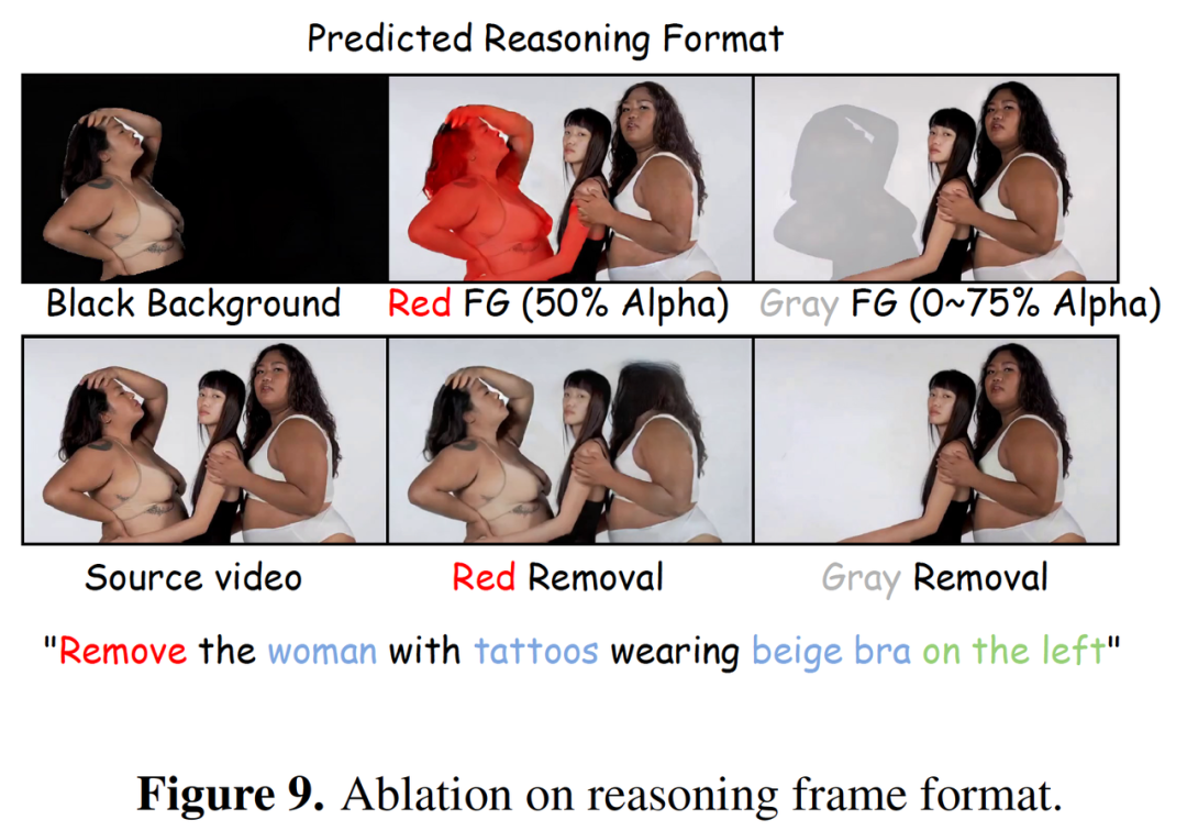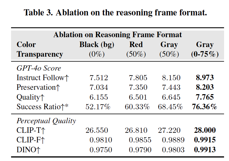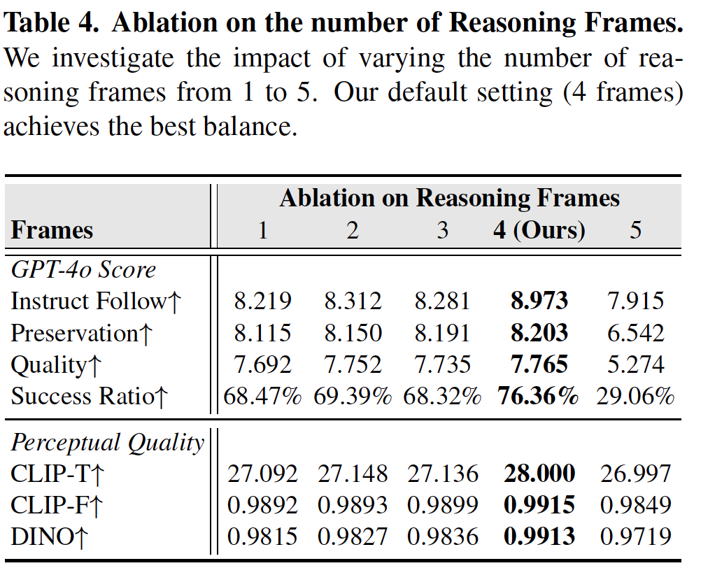 视觉对比 :Black Background(黑背景) :模型没删掉左边的人Red FG(红高亮) :虽然识别了区域,但边缘生硬,同时无法合理移除最左边的女人。Gray FG(渐变灰) :最右侧的 Gray (0~75% Alpha) 展现了完美的移除效果。渐变透明度就像一层“幽灵”遮罩,不仅指示了位置,还充当了从“有”到“无”的柔性视觉过渡。数据碾压 :Table 3 显示,渐变灰格式的 Instruct Follow 高达 8.973,远超黑背景的 7.512 和红高亮的 7.805,成功率更是从 52.17% 暴涨至 76.36%。推理帧数量 (Number of Frames):寻找“黄金平衡点” 请关注 Table 4中的数据趋势: