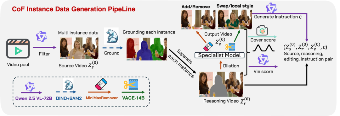训练范式 :模型采用Flow matching训练,预测推理+编辑帧的velocity field作为优化目标。在训练过程中,系统将源视频、推理帧和编辑视频拼接成统一序列,但仅对推理帧和编辑视频部分进行加噪处理和监督。源视频全程保持“clean”状态,作为强大的上下文条件引导生成。推理范式 :推理时,源视频的 Latent 特征被固定,而推理帧和编辑部分从随机高斯噪声开始。通过 ODE 求解器,模型逐步将噪声转化为清晰的画面。极速生成 :得益于 DMD LoRA 技术的加持,VideoCoF 实现了极高的采样效率。原本复杂的编辑任务现在仅需 4 步(4 Steps) 采样即可完成,单条视频的编辑时间缩短至 20-30 秒(H100上),真正实现了即时反馈。数据构建:高质量多实例数据 为了训练这种具有推理能力的模型,团队开发了一套自动化数据生产管线: