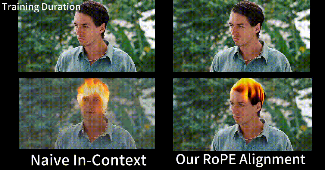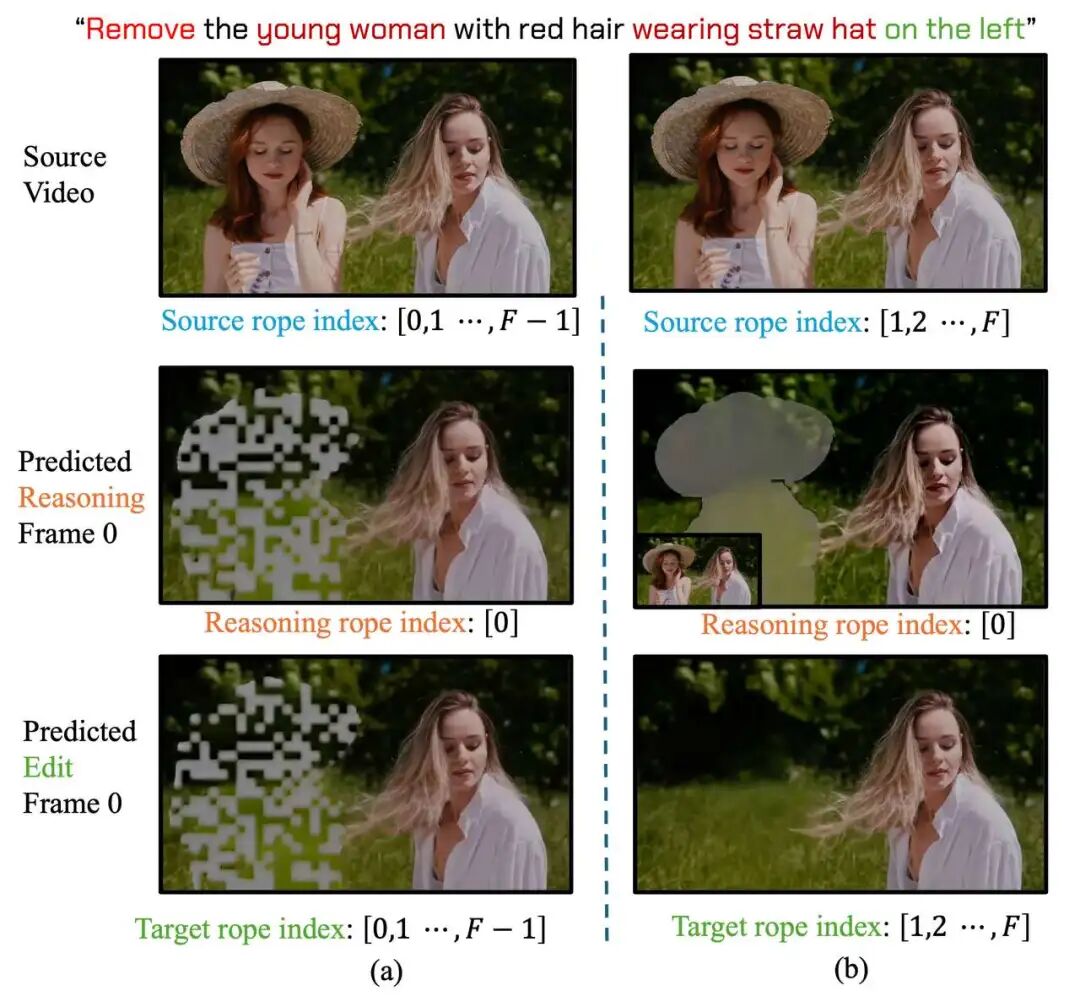 输入序列 :源视频 || 推理帧 || 目标视频。推理帧的形 式:研究发现,使用渐变灰度高亮(Gray Highlight) 作为推理帧的效果最好。这不仅标出了编辑区域,还充当了从源视频到目标视频的视觉过渡。核心逻辑 :模型被要求在生成最终视频前,必须先预测出“在哪里修”。这种显式的推理过程迫使模型深度理解文本指令与空间区域的对应关系。RoPE 对齐策略:打破长度限制 在传统的上下文学习中,简单的时间索引排列会导致模型过拟合于固定长度,无法处理长视频。VideoCoF 提出了一种巧妙的索引重置策略: