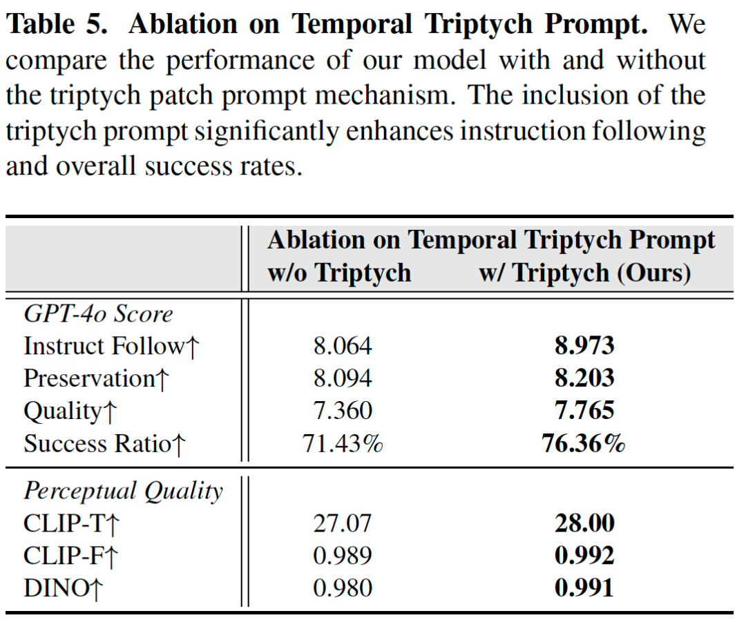 数据拐点 :实验测试了 1 到 5 帧推理帧。可以看到,随着帧数增加,性能稳步提升,在 4 Frames 时达到顶峰(Instruct Follow 8.973, Success Ratio 76.36%)。过犹不及 :一旦增加到 5 帧,成功率断崖式下跌至 29.06%。这说明 4 帧(对应 1 个 Latent Frame)是信息量与计算复杂度的最佳平衡点,过多的推理帧反而会引入噪声,干扰生成。Temporal 三连图 Prompt (Triptych Prompt):提示词的魔法 最后看 Table 5 和 Figure 10: