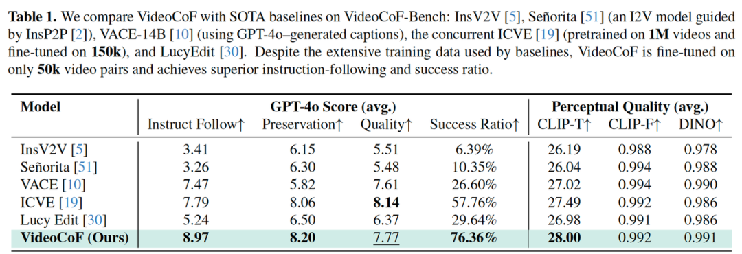 流程 :利用 Qwen-VL 进行实例识别,Grounding-SAM2 进行精准分割,利用GPT-4o想象合理并diverse的编辑prompt, 再配合 VACE-14B 生成object替换/局部风格替换的编辑视频, MiniMax-Remover来生成object 添加/移除的编辑视频。规模 :pipeline在合成了包含移除、添加、交换,局部风格替换等任务的高质量三元组数据,还进一步根据dover score和vie score来筛选高质量合成数据样本,最终精选出 50k 核心样本,涵盖了大量复杂的空间关系和多物体交互场景。实验结果 性能对比:小数据,大胜出 在 VideoCoF-Bench 上,VideoCoF 与 InsV2V、Señorita、VACE、ICVE(同期工作)等进行了对比。