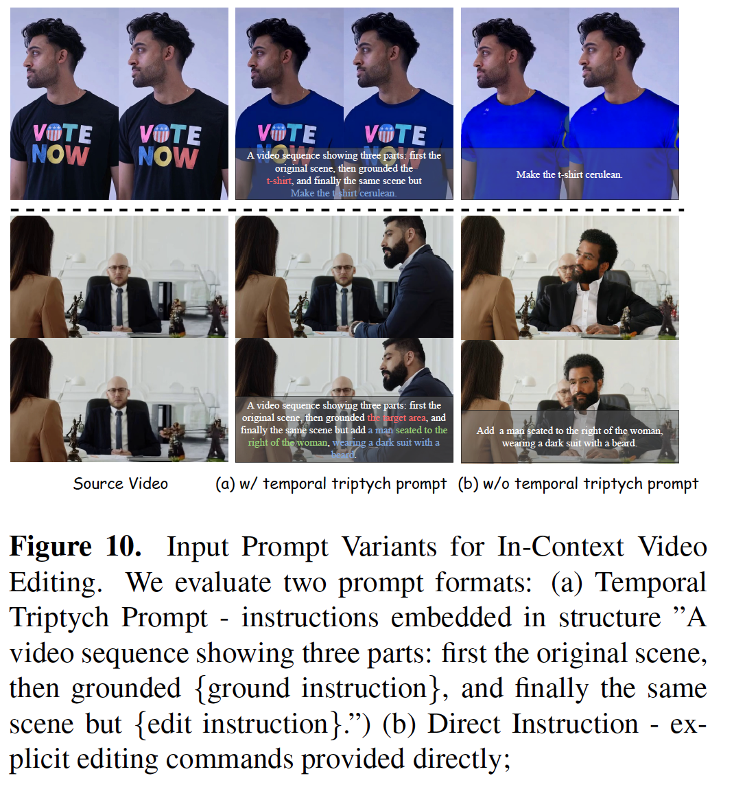 Prompt 结构 :图10展示了特定的 Prompt 写法:“A video sequence showing three parts: first the original scene, then grounded... and finally the same scene but...”。这种结构强行让模型在时序上理解“原片-推理-成片”的逻辑。效果对比 :(b) w/o Triptych :第三列的图,将T恤衫换成蓝色时,抹除了文字并且蓝色诡异,添加的男人位置错误十分不合理 (a) w/ Triptych :左下角的图,在三连图 Prompt 引导下,衣服换成蓝色的同时完美的保留了文字,添加的男子西装笔挺、胡须清晰,并且位置合理,与“wear a dark suit with a beard”的指令完美契合。 量化提升 :Table 5 显示,加上这句 Prompt,指令遵循分从 8.064 提升至 8.973,证明了这种结构化提示对激活模型推理能力的巨大价值。总结 VideoCoF 的提出,打破了视频编辑领域长期存在的“精度 vs 统一性”僵局。通过引入帧链的推理机制(Chain-of-Frames),VideoCoF 证明了让模型先“看懂”再“动手”是提升编辑质量的关键 。 更令人振奋的是,VideoCoF 展现出的极高数据效率(50k data)和长视频泛化能力,为未来开发更通用、更低成本的视频编辑大模型指明了方向。也许在不久的将来,我们每个人都能用一句话,像修图一样轻松地修改长电影片段。