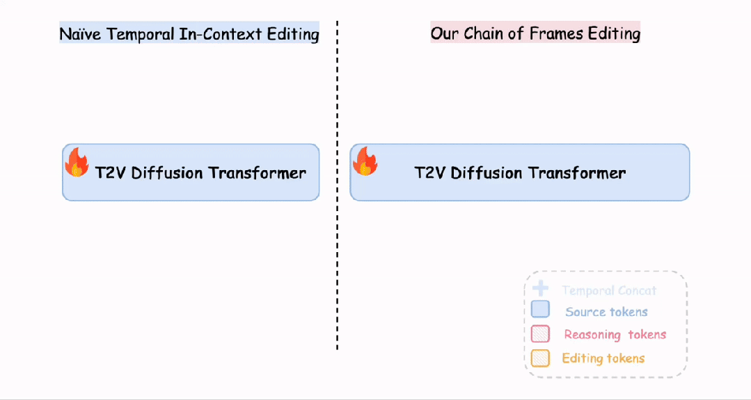 总结速览 解决的问题 精度与统一性的两难困境 :现有的专家模型依赖掩码,精度高但模型无法统一;而统一的上下文模型虽然架构简洁,但缺乏显式的空间提示,导致指令与区域映射微弱,定位不准。长视频外推能力缺失 :现有模型通常难以处理超出训练时长的视频,简单的时序拼接会导致位置编码失效,产生运动错位或伪影。提出的方案 VideoCoF 框架 :提出了一种受思维链(CoT)启发的“帧链”(Chain-of-Frames)方法,将视频编辑重构为“看 -> 推理 -> 编辑”的串行过程。显式推理机制 :强制视频扩散模型在生成目标视频之前,不同于ChronoEdit等隐式的采用reasoning token的方式(无ground truth的reason token),VideoCoF先预测代表编辑区域的“推理 Token”(推理帧),从而实现无掩码的精准编辑。应用的技术 灰度渐变推理帧 :通过实验发现,使用渐变透明度的灰色高亮区域作为推理帧,比纯黑掩码或红框更能有效引导模型进行空间推理。RoPE 对齐与外推策略 :设计了一种特殊的旋转位置编码(RoPE)重置策略(推理帧索引固定为 0,源/目标视频索引为 1-F),解决了索引冲突,支持模型在推理时处理 4 倍于训练长度的视频。多实例数据生成管线 :利用 Qwen-VL、Grounding-SAM2 和 VACE 等工具,构建了包含 50k 高质量多实例编辑三元组的数据集。达到的效果 高效率下的 SOTA 性能 :相比于使用 1M 视频预训练外加 150k 微调数据的强力基线(如 ICVE),VideoCoF 仅需 50k 视频对微调,指令遵循得分即达到 8.97(提升 15.14%),成功率高达 76.36%(提升 18.6%)。完美的长度泛化 :模型仅在 33 帧上训练,即可流畅推理 141 帧以上的长视频,且保持出色的运动一致性。全能统一的编辑范式 :实现了基于“帧链”方式的统一无 Mask 视频编辑,涵盖实例级(Instance)和局部级(Part-level)的对象移除、添加、交换及局部风格转换。该范式具有极强的灵活性,可进一步拓展至全局风格化(Global Style)和 ID 驱动编辑等任务。完全开源与极速推理 :目前模型权重、代码已全部开源,训练数据将在本周开源,结果可复现。在 DMD LoRA 的加持下,模型仅需 4 步采样即可完成生成,实现 20-30 秒编辑一条高清视频的极速体验。方法详解 Chain of Frames (CoF):让生成模型先“思考” VideoCoF 的核心架构基于标准的 Video DiT(Diffusion Transformer)。与以往简单地将“源视频”和“噪声目标视频”拼接不同,VideoCoF 在中间插入了推理帧(Reasoning Frames) 。