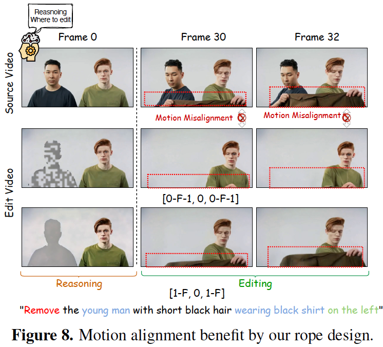 量化提升 :引入 CoF 设计后,指令遵循分数(Instruct Follow)从 8.109 飙升至 8.973,成功率(Success Ratio)从 72.41% 提升至 76.36%。视觉实证 :在右图中,左侧(不带推理帧)指令是需要模型删除右边的人,但删除错误删除了左边的人;而右图(带推理帧)通过先预测灰度掩码,精准锁定了编辑区域(右侧穿绿色衣服的人),使得后续的编辑帧(Editing)能完美继承推理帧的编辑区域实现精准的多实例级别的移除。Repeat RoPE 策略:对齐运动与无限外推 结合 Table 2 和 figure8 和右侧gif图来看 RoPE 设计的决定性作用: