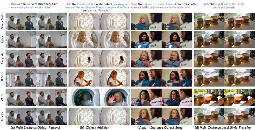 指令遵循(Instruct Follow):VideoCoF 得分 8.97,远超 ICVE 的 7.79。 成功率(Success Ratio):高达 76.36%,比第二名高出近 20 个百分点。 数据量:VideoCoF 仅微调了 50k 数据,而 ICVE 预训练了 1M 数据并微调了 150k 数据。这证明了“帧链”范式的极高效率。 可视化展示 无论是移除画面右侧的特定人物、在洗衣机里添加一个小女孩,还是去推理哪个碗更大并且变得更白和光亮,VideoCoF 都能精准定位并自然融合。