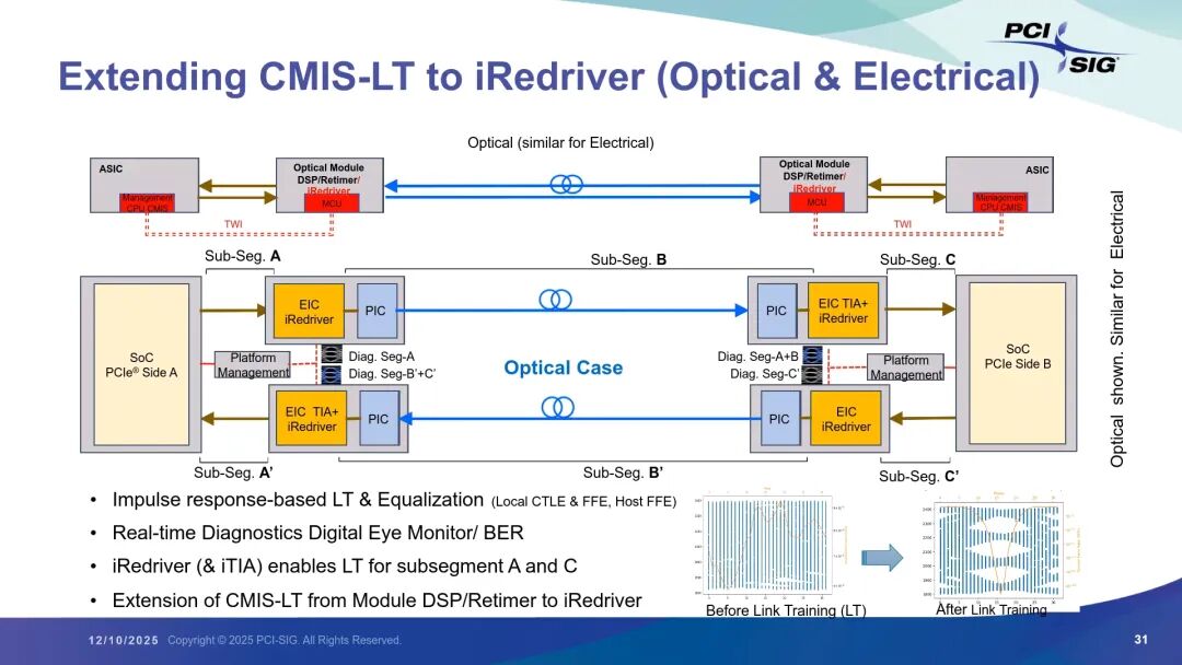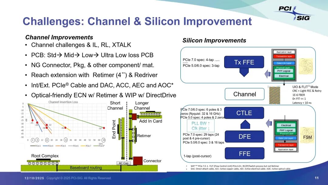 在AI基础设施中,iRedriver的应用场景包括:芯片间互联(当PCB长度超过PCIe 7.0最大距离时,提供50%链路余量提升)、背板与扩展卡连接(多连接器场景下优化链路预算)、XPU间铜缆互联(配合DAC线缆实现低延迟连接)、光模块驱动(与iTIA配合,支撑光链路的链路训练与诊断)。值得注意的是,PCI-SIG正在推进DirectDrive ECR规范,旨在实现无Retimer的长距离传输,而iRedriver正是这一规范的核心支撑器件。 三、技术挑战与解决方案:信号完整性与硅片的双重优化 PCIe速率的持续提升,需要信号完整性与硅片技术的协同突破: