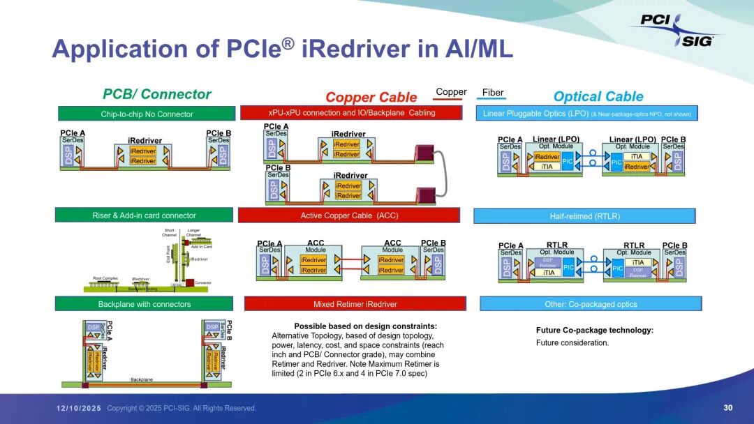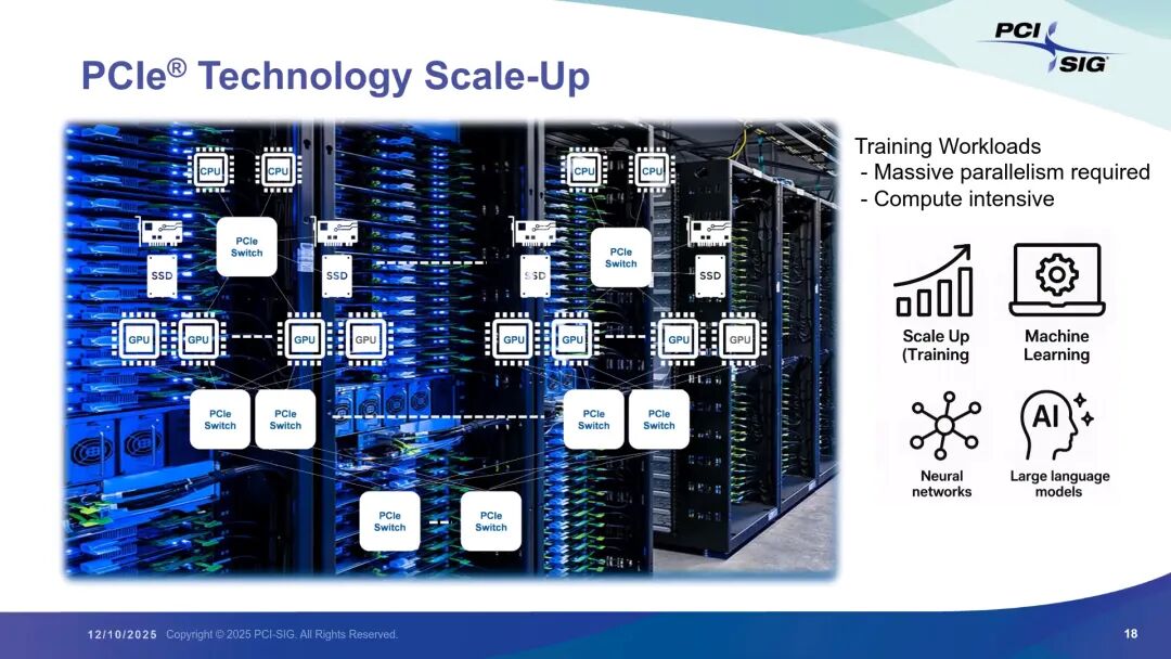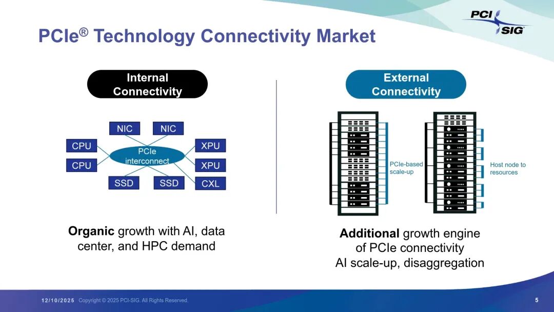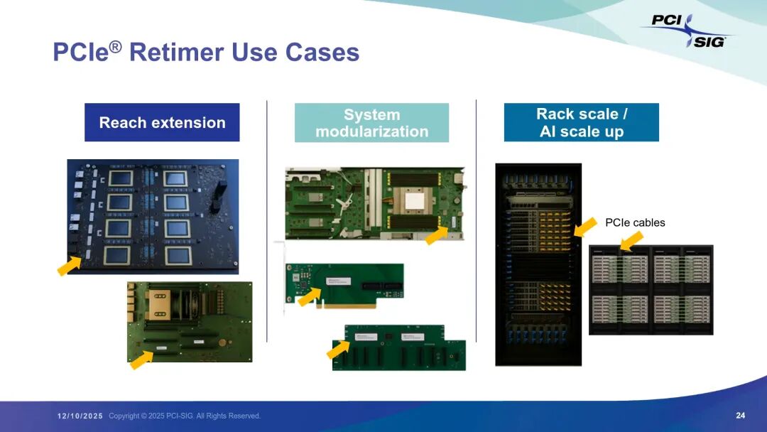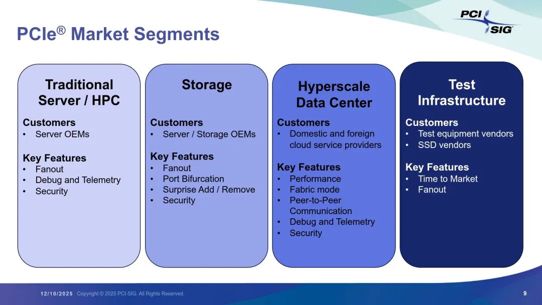- 传统服务器/HPC:核心需求包括热插拔(Surprise Add/Remove)、端口分叉与扇出(Fanout),由服务器OEM主导功能定义; - 存储领域:聚焦NVMe存储支持、端到端通信(Peer-to-Peer)、安全与诊断能力,服务器与存储OEM共同推动技术迭代; - 超大规模数据中心:由云服务提供商(CSP)主导,追求快速上市(Time to Market)、高带宽fabric、多主机支持等特性,节奏远超以往; - 测试基础设施:虽市场规模较小,但为PCIe合规测试提供核心支撑,是生态成熟的关键保障。