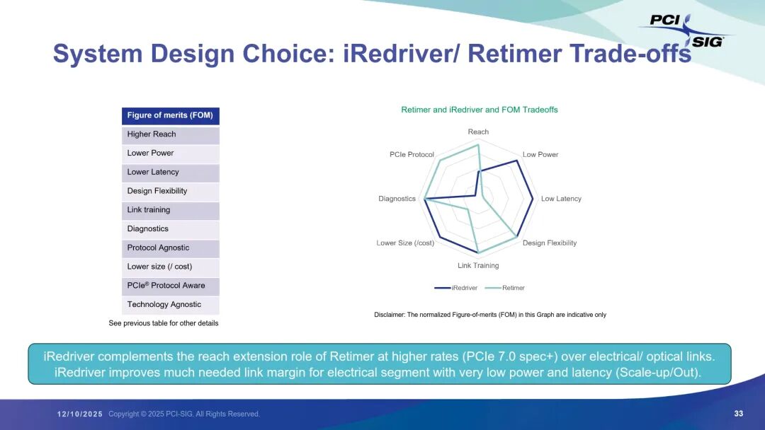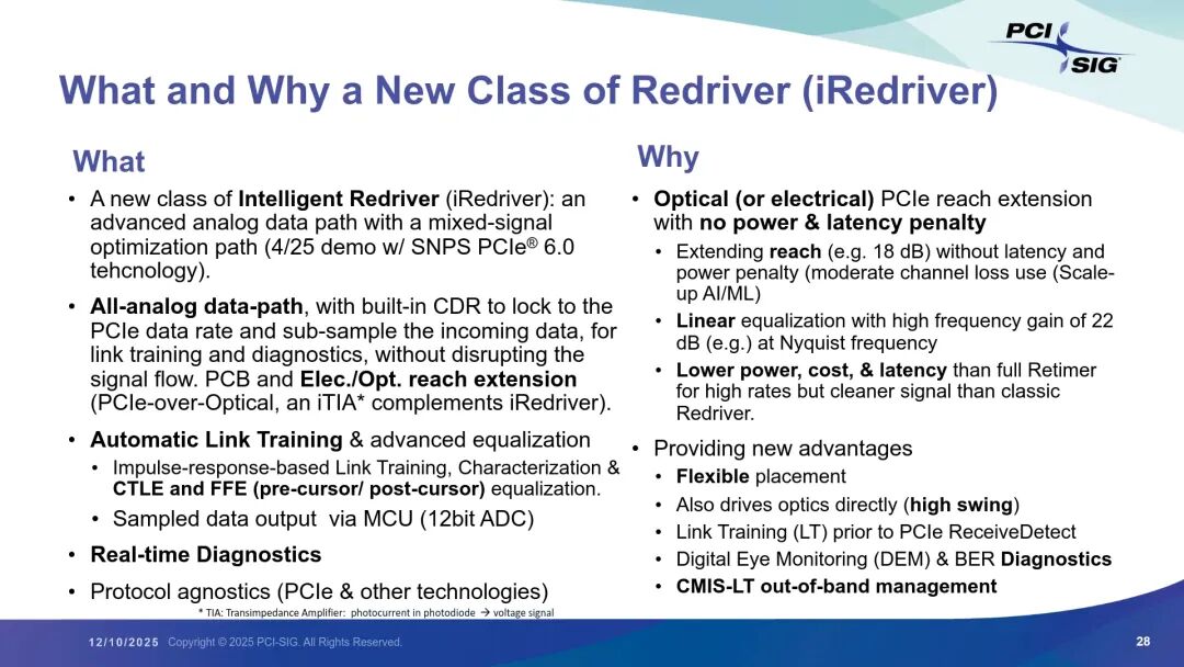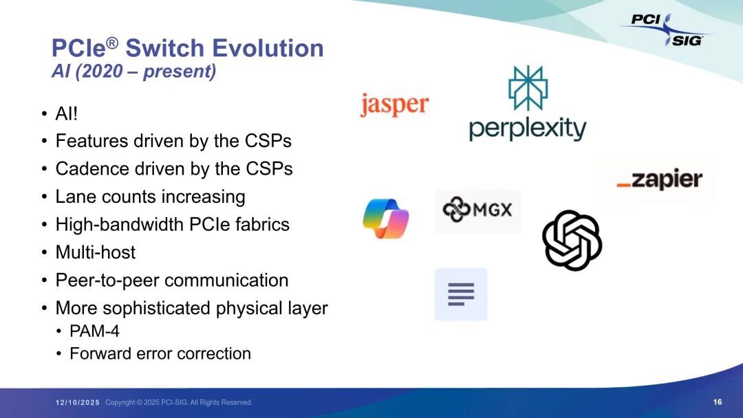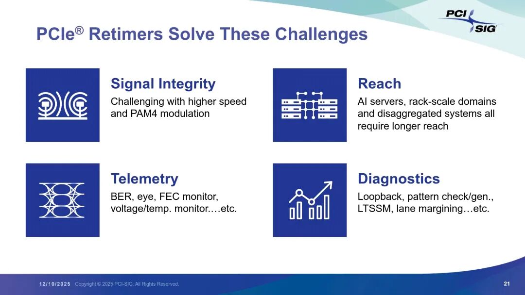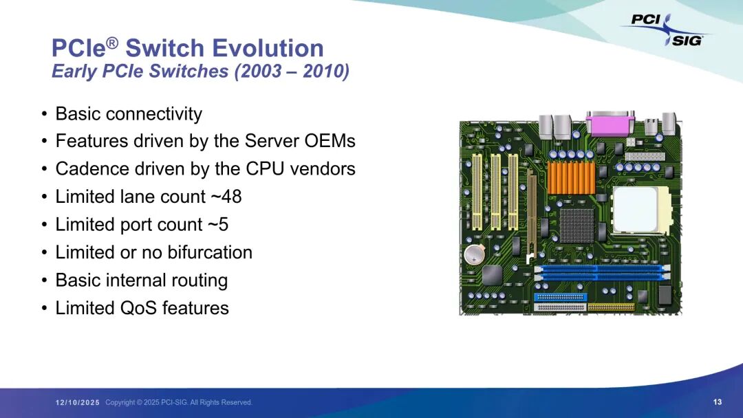- 传统服务器/HPC:核心需求包括热插拔(Surprise Add/Remove)、端口分叉与扇出(Fanout),由服务器OEM主导功能定义; - 存储领域:聚焦NVMe存储支持、端到端通信(Peer-to-Peer)、安全与诊断能力,服务器与存储OEM共同推动技术迭代; - 超大规模数据中心:由云服务提供商(CSP)主导,追求快速上市(Time to Market)、高带宽fabric、多主机支持等特性,节奏远超以往; - 测试基础设施:虽市场规模较小,但为PCIe合规测试提供核心支撑,是生态成熟的关键保障。