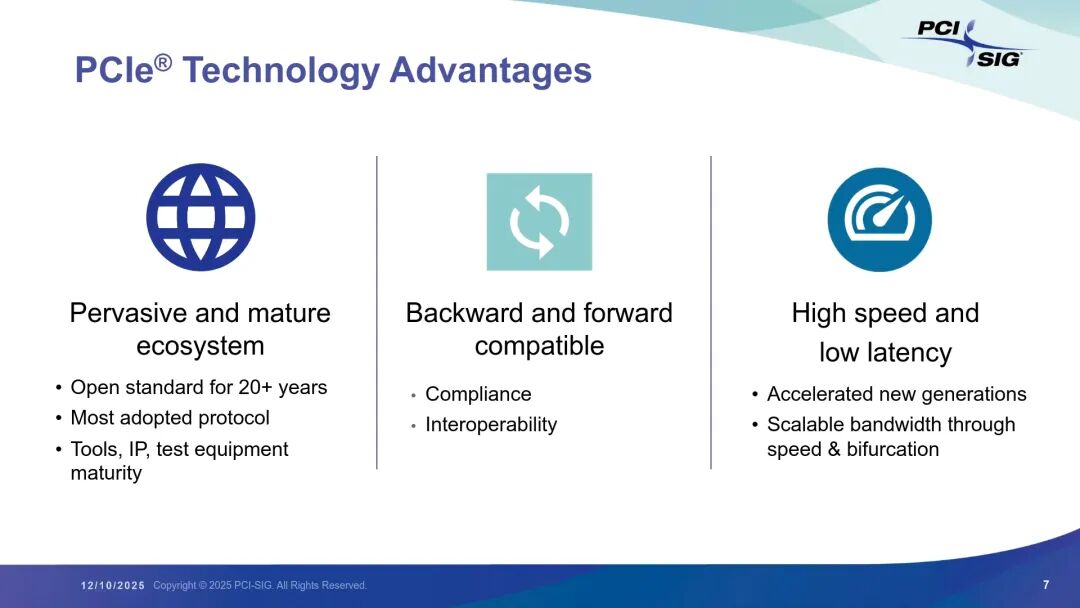 PCIe协议自诞生以来已走过20余年历程,凭借三大核心优势成为行业最普及的开放标准:一是成熟且普及的生态系统,工具、IP、测试设备一应俱全, 互操作性与合规性经过长期验证;二是完备的前后向兼容性,PCI-SIG的合规测试确保新老设备无缝对接;三是高速低延迟与可扩展带宽,通过速率提升与端口分叉(bifurcation)配置,满足不同场景的性能需求。