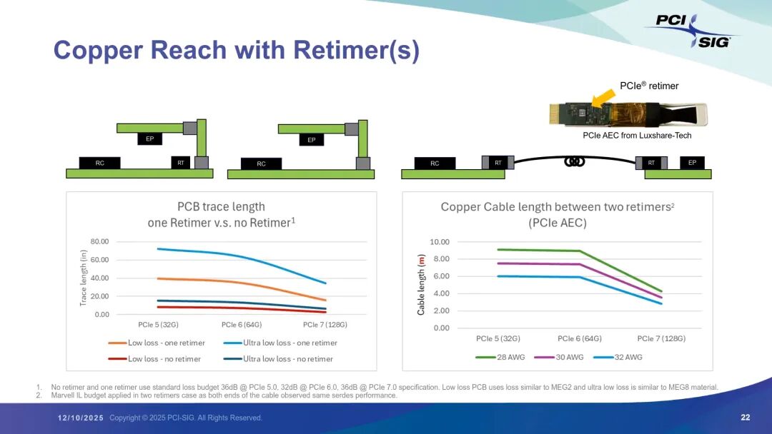 在传输距离扩展方面,Retimer的作用尤为显著:PCIe 7.0在低损耗PCB上无Retimer时,传输距离不足10英寸,而加入1个Retimer后可延长至20英寸;若采用超低损耗PCB,传输距离可进一步扩展至35英寸。在外部连接场景,Retimer集成于线缆连接器形成PCIe AEC(Active Electrical Cable),PCIe 5.0/6.0下可实现6-8米铜缆传输,PCIe 7.0下也能达到3-4.5米。