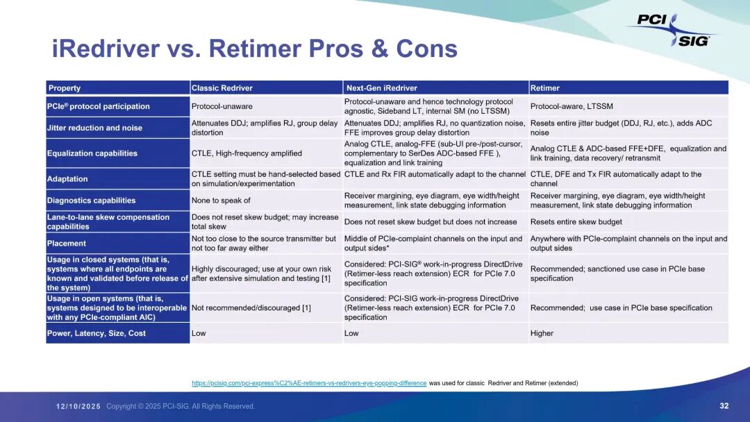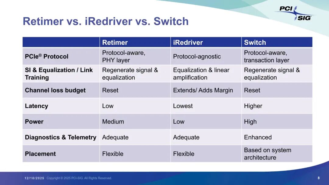 二、关键器件解析:Retimer、iRedriver与Switch的技术特性与演进 1. 三类器件核心差异与定位 PCIe生态的三类关键器件在协议支持、信号处理、性能表现等方面各有侧重,共同支撑不同场景的连接需求: