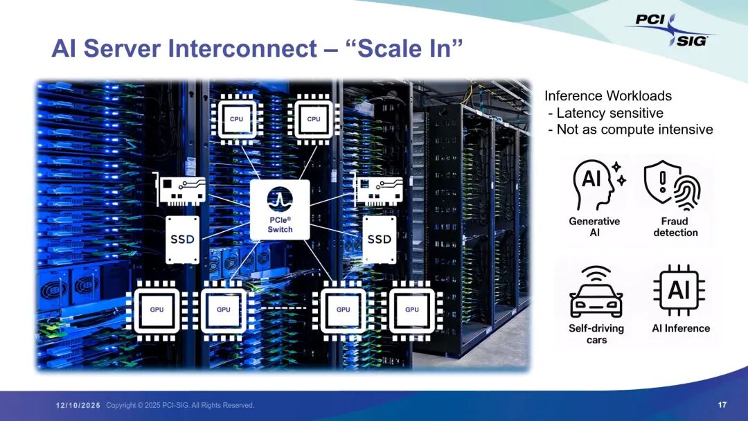 AI场景的爆发式增长成为PCIe技术演进的核心驱动力:无论是低延迟敏感的推理工作负载(如自动驾驶、欺诈检测),还是需大规模并行计算的训练工作负载(如大语言模型训练),都对PCIe的带宽、延迟、传输距离提出了更严苛的要求,也直接推动了Retimer、iRedriver与Switch的技术升级。