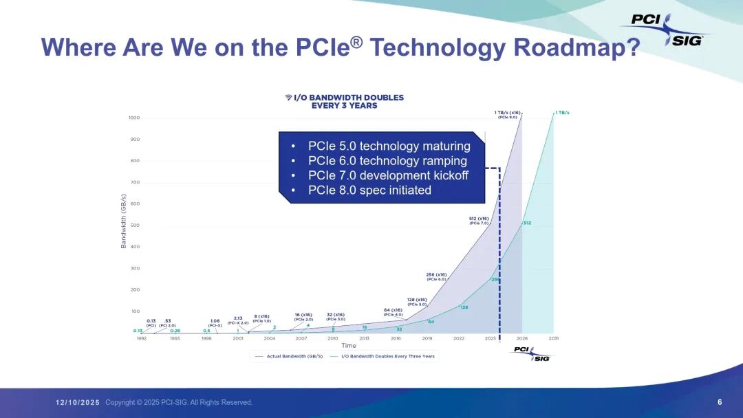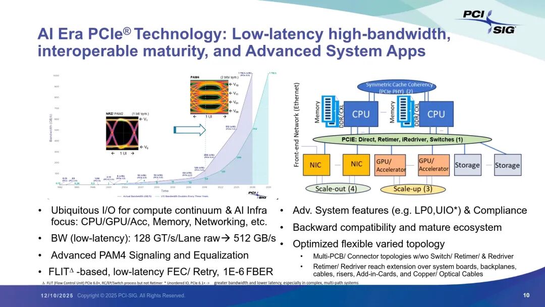从技术路线图来看,PCIe带宽每三年翻倍的节奏持续兑现:2025年末,PCIe 5.0技术已走向成熟,PCIe 6.0进入规模化部署阶段,PCIe 7.0规范正式定稿(芯片与测试设备研发同步推进),而PCIe 8.0的预研工作已启动。其中,PCIe 7.0实现了128 GT/s每通道的原始速率,x16链路带宽可达512 GB/s,核心技术突破源于PAM4调制与FLIT(Flow Control Unit)编码,配合低延迟前向纠错(FEC)与重试机制,实现了1E-6的误码率(FBER),满足AI场景的高可靠性要求。