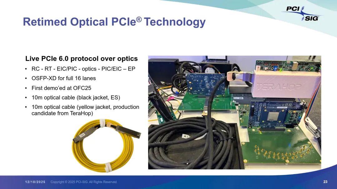 在光传输领域,Marvel在OFC 2025上演示了全球首个PCIe 6.0光链路方案,通过1个Retimer配合10米光缆,实现16 lane、64 GT/s的协议传输,验证了PCIe跨机架光互联的可行性。