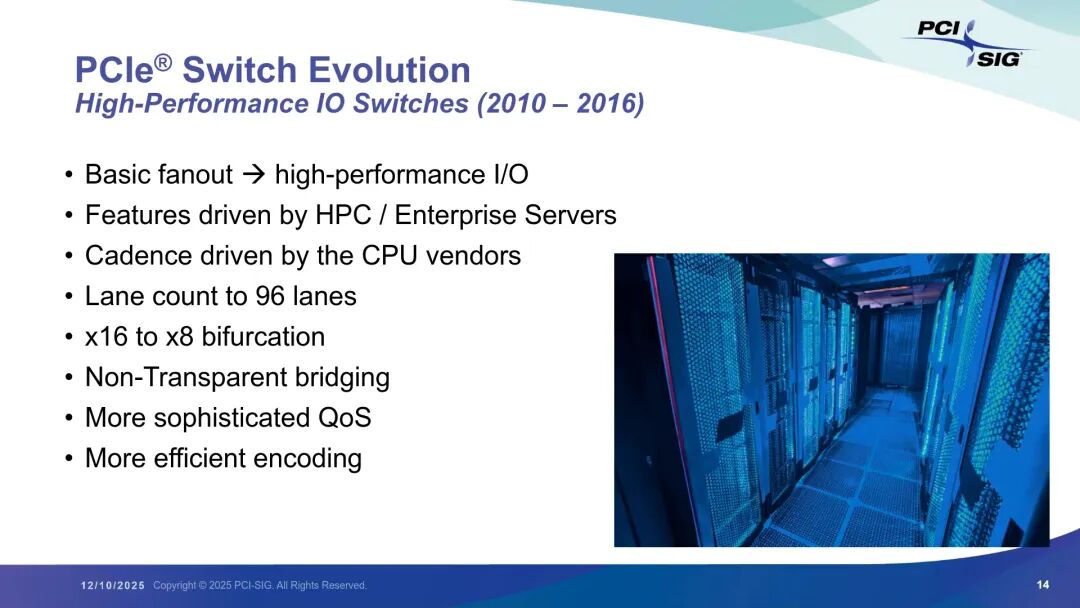 - 高性能IO阶段(2010-2016):受HPC与企业服务器需求驱动,lane数提升至96,支持x16到x8分叉,引入非透明桥接(Non-Transparent bridging)与更高效的128b/130b编码,QoS功能升级;
