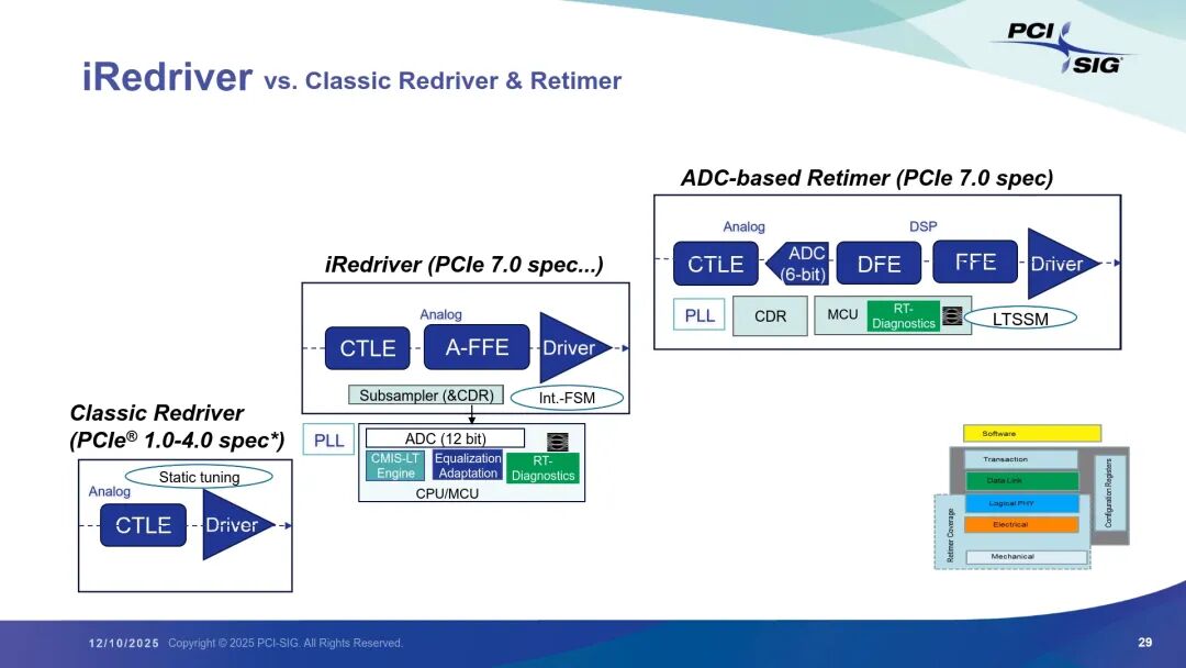 PCIe 7.0及以上版本对功耗与延迟的极致追求,催生了iRedriver这一新器件品类。与传统Redriver的静态调优不同,iRedriver采用全模拟数据路径,集成CTLE、模拟FFE(子UI预/后抽头)与CDR,可自动适配通道特性,无需手动配置;通过12位ADC与MCU实现子采样,支持实时诊断与数字眼图监控,且不干扰PCIe数据传输。