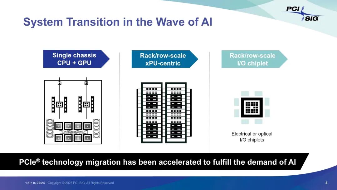 在人工智能浪潮的推动下,数据中心架构正经历从单机箱CPU+GPU模式向机架/行级XPU中心化、IO小芯片化的深刻转型。PCIe(PCI Express)技术作为连接计算、存储、网络资源的核心协议,为满足AI场景对高带宽、低延迟、复杂拓扑的需求,加速了代际迭代与功能升级。Retimer(重定时器)、iRedriver(智能重驱动器)与Switch(交换机)作为PCIe生态的关键器件,不仅解决了高速传输中的信号完整性、传输距离等核心挑战,更成为支撑AI规模化部署的“基石”。本文将基于PCI-SIG 2025年技术研讨会核心内容,深入解析PCIe技术演进、三类关键器件的技术特性与差异、应用场景及未来趋势,还原AI时代PCIe架构革新的完整图景。