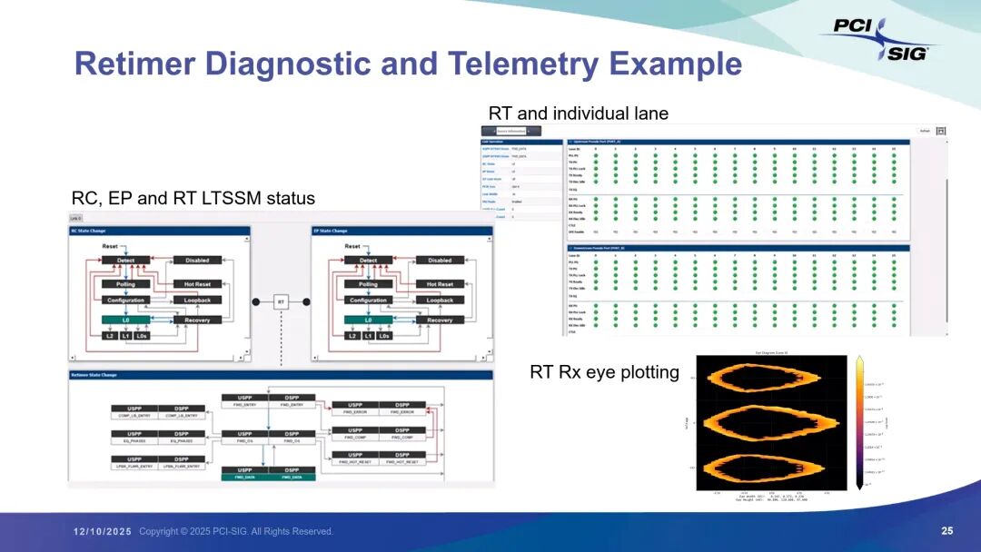 Retimer的应用场景覆盖AI服务器、机架级系统与解耦架构:在GPU基板上,每个GPU配置1个Retimer,优化CPU到GPU的信号传输;在主板上,Retimer靠近PCIe插槽部署,提升扩展卡的信号质量;在背板与线缆中,Retimer则成为延长传输距离、保障信号完整性的核心器件。此外,Retimer还具备丰富的诊断与遥测能力,可监控LTSSM状态、绘制接收端眼图、跟踪单通道状态,为系统维护提供关键数据。