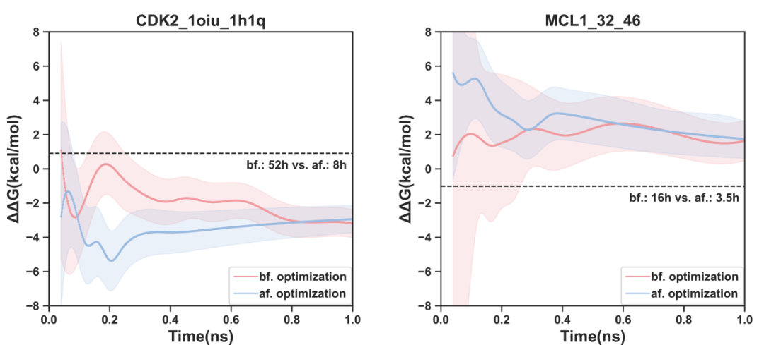 与直接预测自由能不同,LamNet还能够通过预测窗口级自由能来协助评估相邻λ 窗口之间的重叠度,从而优化λ的设置,进一步提升炼金术自由能计算的效率。这构成了研究探索的第三类应用场景。借鉴Zeng等人的经验,研究以相邻窗口之间的自由能差值作为衡量窗口重叠程度的指标,并设定10 kcal/mol的阈值。在0-1的区间内以0.001 为步长对每个窗口的自由能进行预测,并基于预测结果通过优化算法给出推荐的λ窗口划分。为验证该策略能否提升经典计算的效率,研究选取了两组复合物(CDK2_1oiu_1h1q和MCL1_32_46),比较优化前后的计算收敛情况。