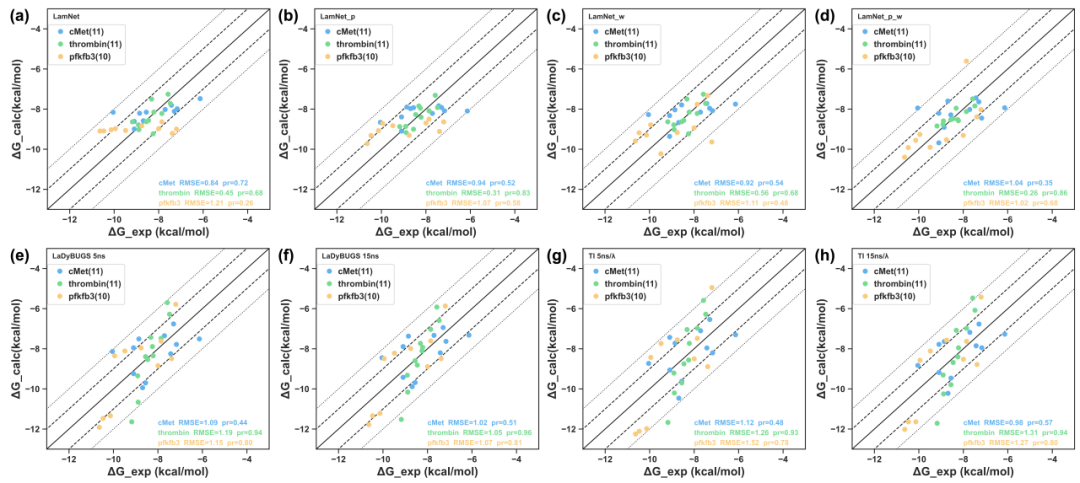 与LaDyBUGS和TI相比,LamNet及其不同变体在RBFE预测中表现出更高准确性,并保持了良好的一致性。如图3所示,其中(a-d)为LamNet各变体,(e-h)为不同采样设置下的LaDyBUGS与TI。在cMet体系中,LamNet的准确性与排序表现最佳(RMSE = 0.84 kcal/mol,Pearson r = 0.72)。在thrombin体系中,LamNet_p_w的准确性最高(RMSE = 0.31 kcal/mol),并保持较好的排序能力(Pearson r = 0.86)。pfkfb3的结论类似(RMSE = 1.02 kcal/mol,Pearson r = 0.68)。此外,LamNet的数据驱动特性带来了显著的计算效率提升。TI每个窗口通常需要5 ns的采样,对应约2000 GPU 小时/靶点;LaDyBUGS总采样时长为5 ns,对应约20 GPU 小时/靶点。而LamNet在单张GPU上仅需不到一分钟即可完成一个靶点的预测,实现了3-4个数量级以上的加速。