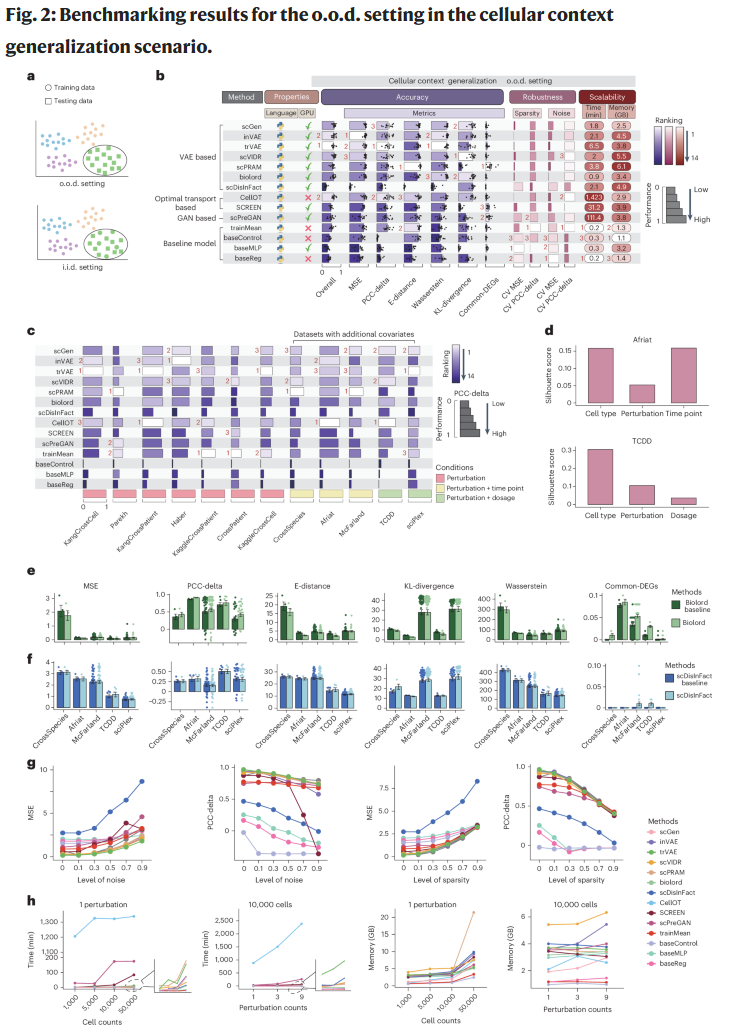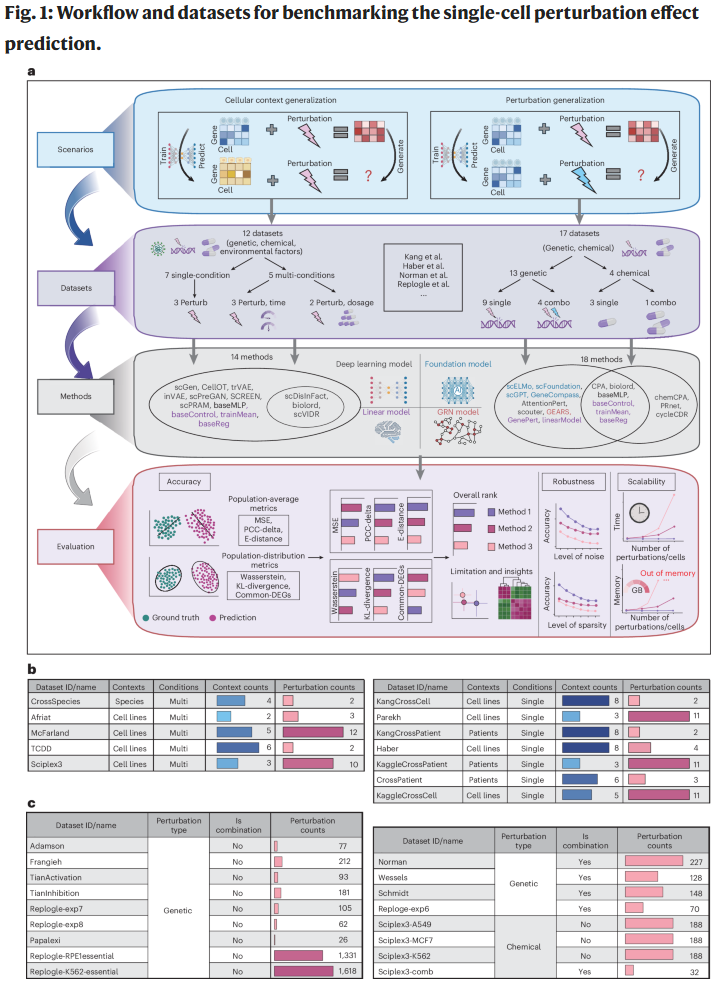 计算预测方法因此成为重要替代方案。现有方法涵盖线性模型、深度学习模型以及近年来兴起的单细胞基础模型。但在多个独立研究中,研究人员逐渐意识到:在同一数据集上表现良好的模型,往往在新的细胞类型或新扰动条件下表现不佳。这引发了对模型“泛化性”的系统性质疑,也凸显了统一基准评测的必要性。