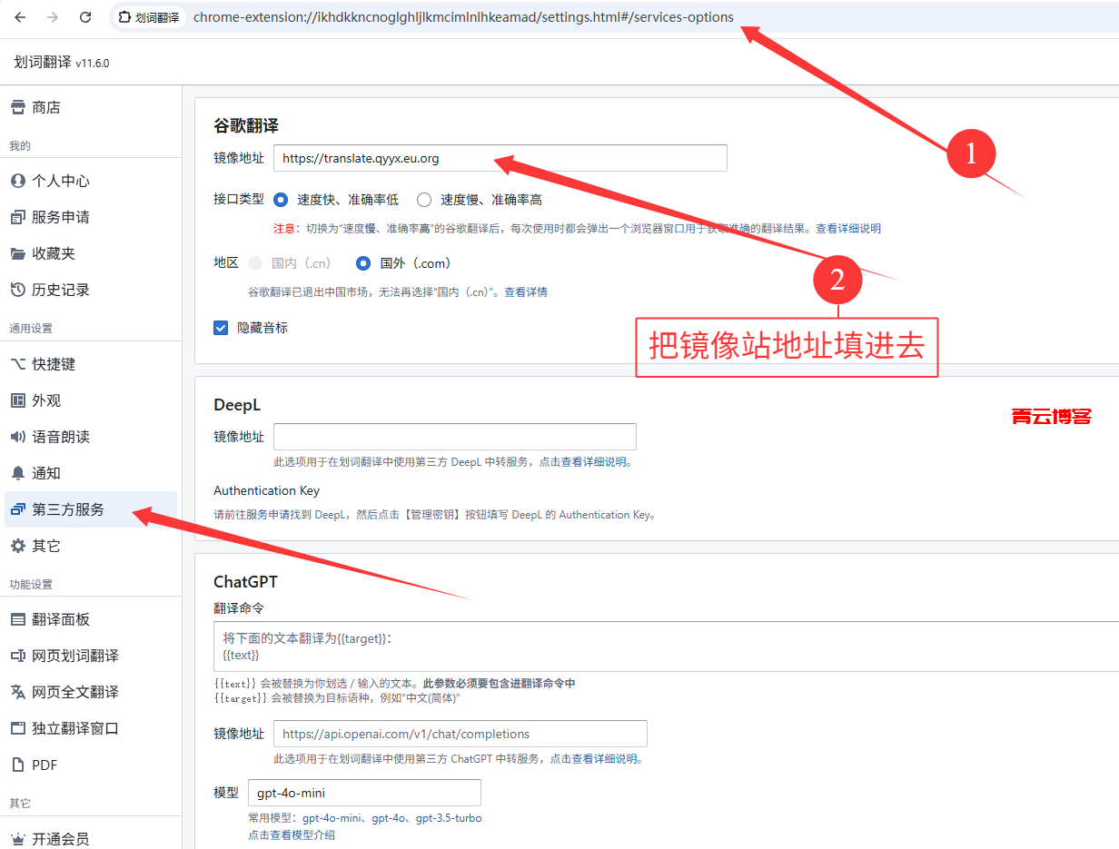 安装完扩展打开设置-第三方服务:chrome-extension://ikhdkkncnoglghljlkmcimlnlhkeamad/settings.html#/services-options