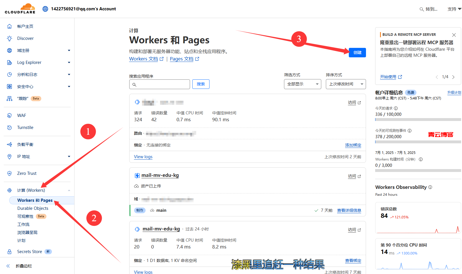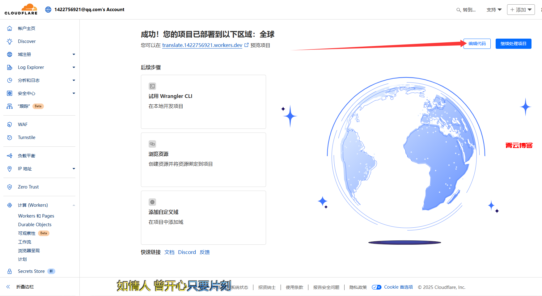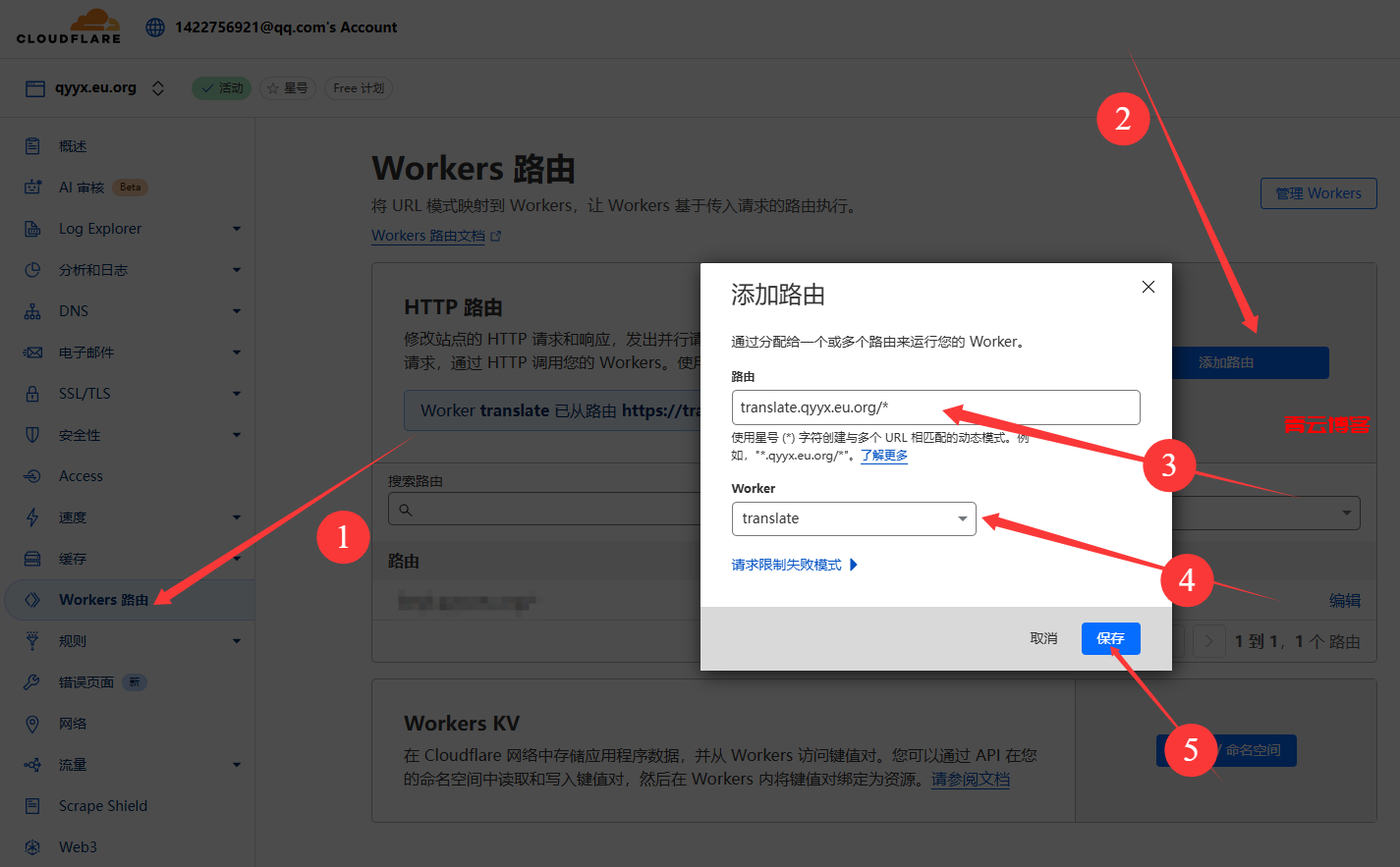 路由填刚刚解析的域名:域名/* (后面要有斜杠和一个星号),worker选择刚刚部署代码的那个worker