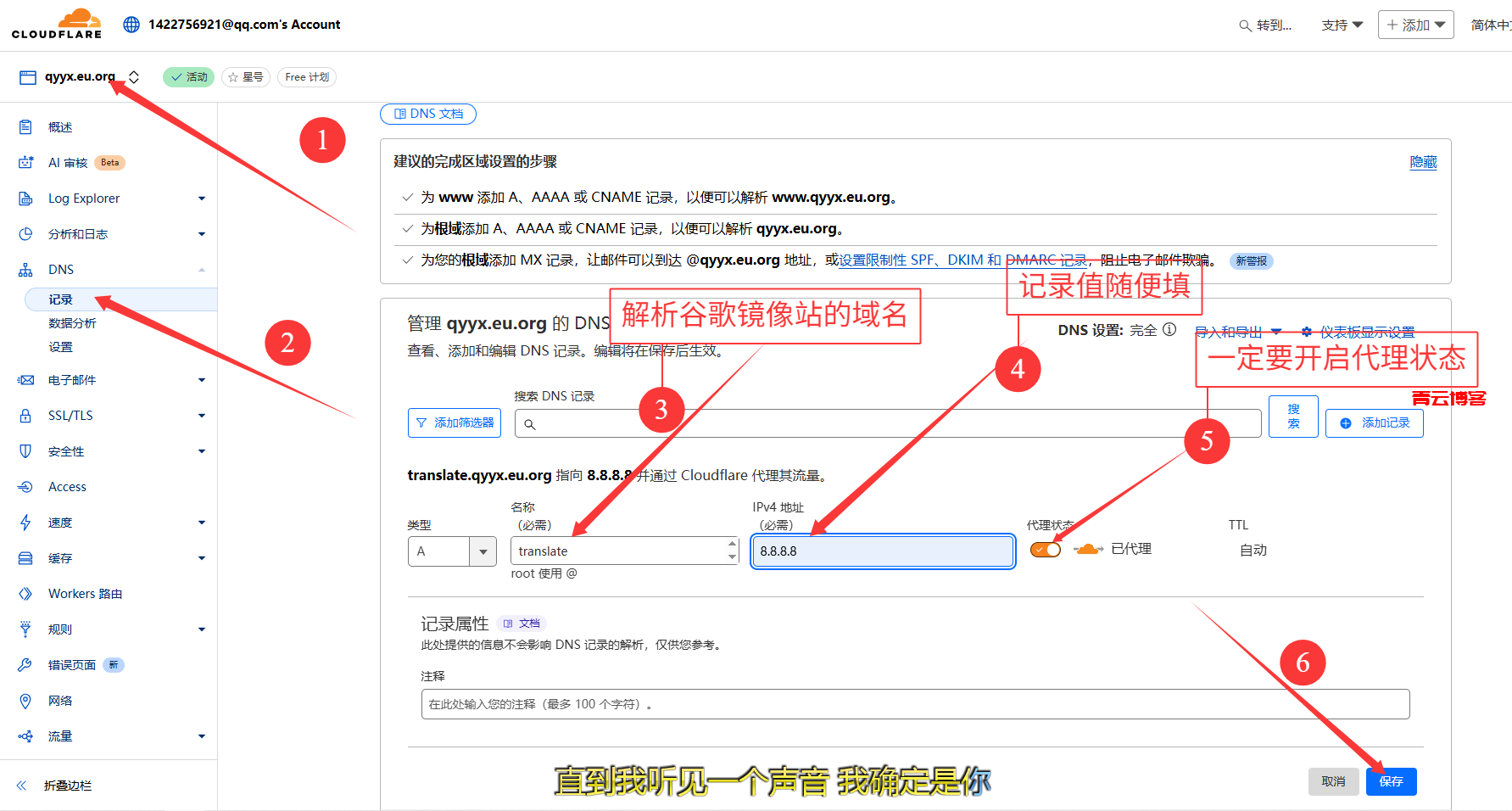 来到你的域名管理页面,添加一条解析,为谷歌镜像站,记录值随便填,然后开启代理状态