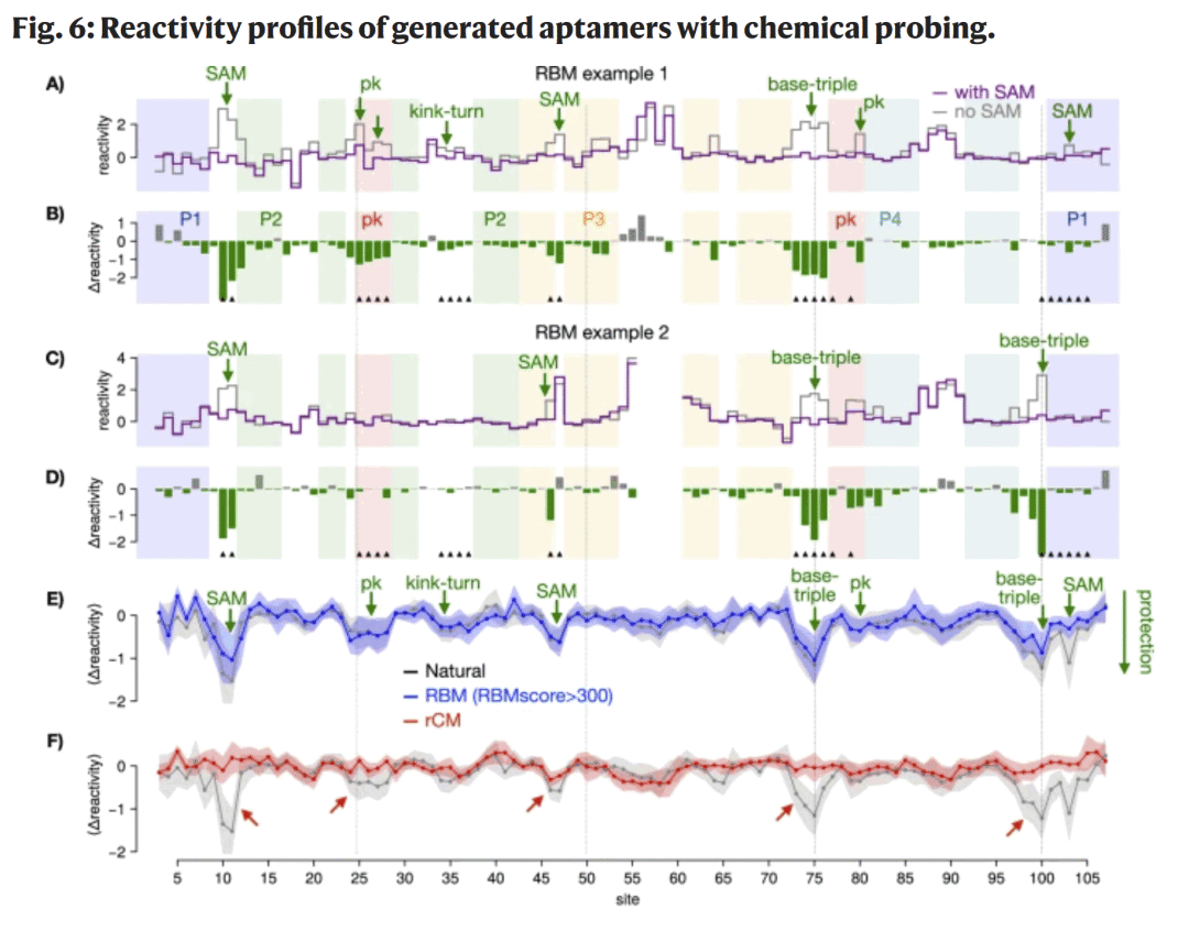 在 476 条 RBM 设计序列中,高评分序列表现出与天然适配体相似的 SAM 诱导构象变化,其化学反应性变化集中于配体结合位点、假结和关键螺旋区域。