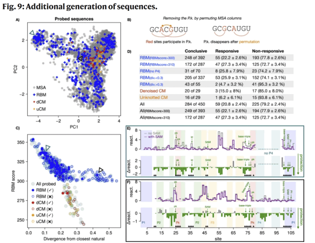 在进一步的设计–实验循环中,RBM 仍能生成高比例可切换 RNA,包括缺失某些螺旋或与天然序列差异极大的新序列,显示出良好的泛化能力。