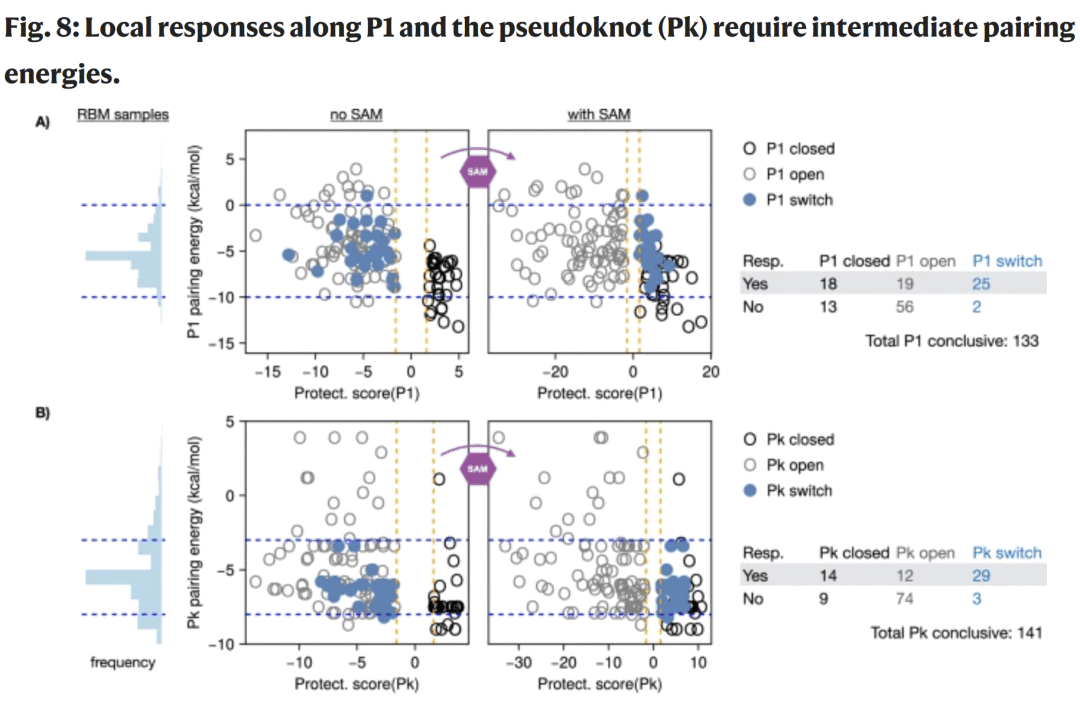 分析显示,能够发生切换的 RNA 在关键螺旋和假结区域具有中等配对能量,既避免过度稳定,也防止结构过于松散。RBM 生成序列天然偏向这一能量窗口,从而提高了功能成功率。
