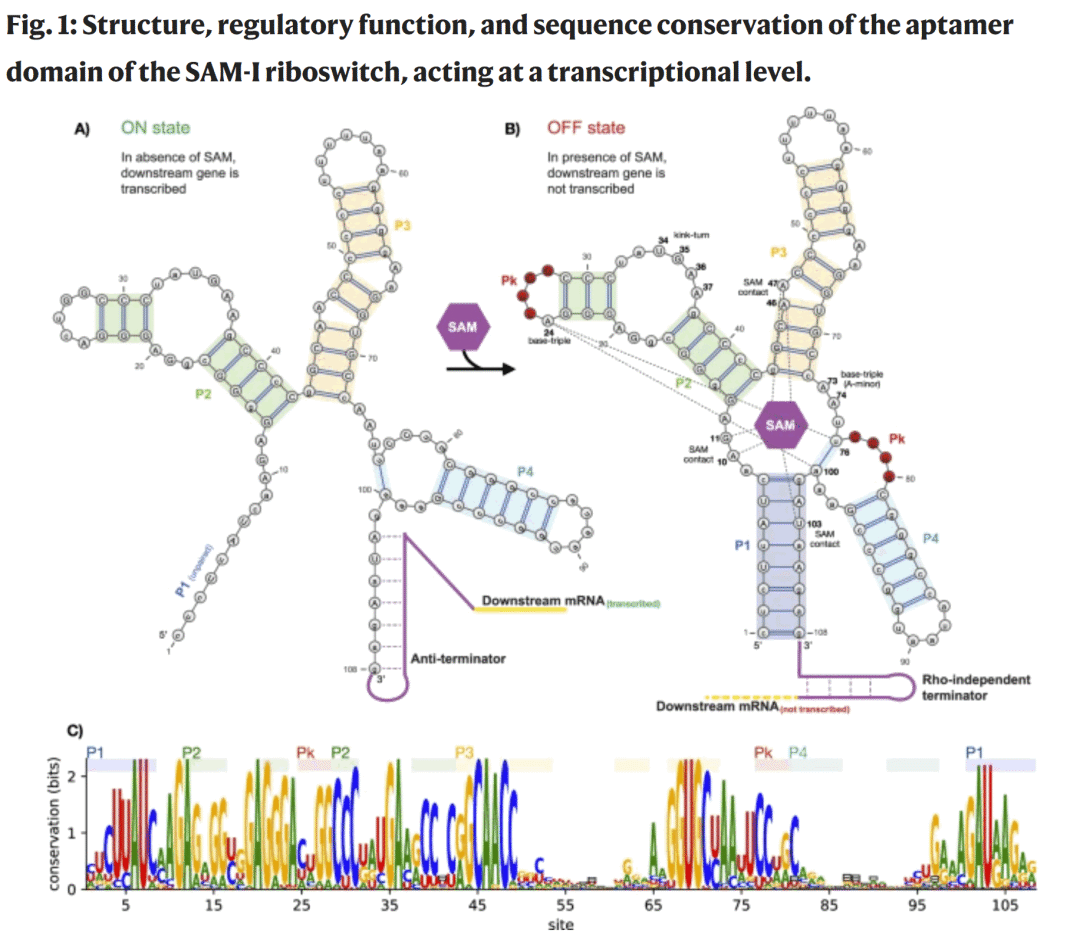 图1| SAM-I 核糖开关适配体的结构、功能与序列保守性。