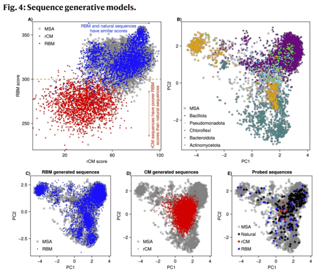 与协方差模型相比,RBM 生成序列在主成分空间中更好地覆盖天然序列的多样性,能够产生远离已知序列、但仍满足功能约束的候选 RNA。