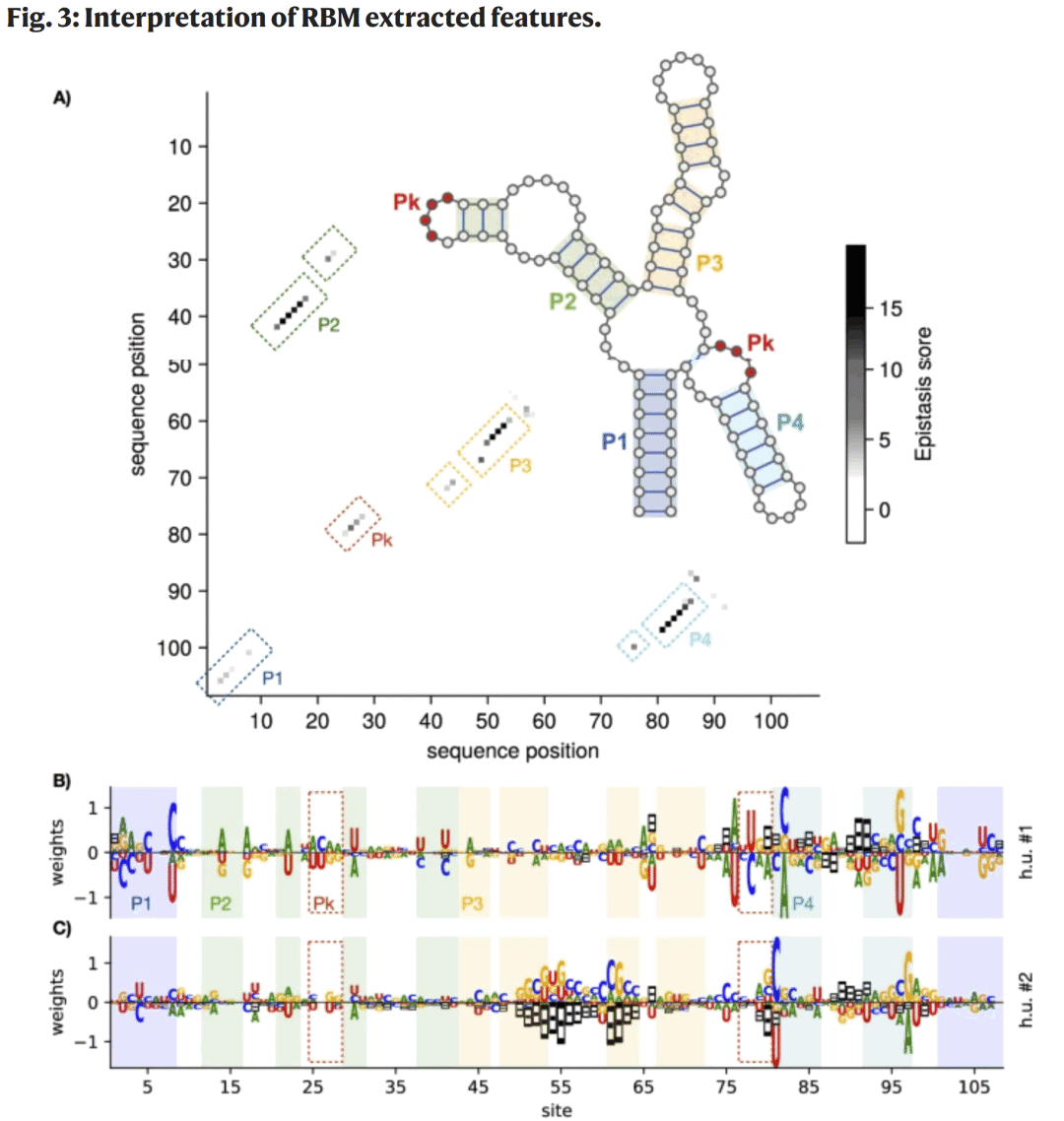 RBM 从序列统计中自动识别出与螺旋、假结和三级接触相关的关键特征,其推断的位点相互作用与已知结构高度一致,证明模型能够捕获超越简单二级结构的高阶约束。