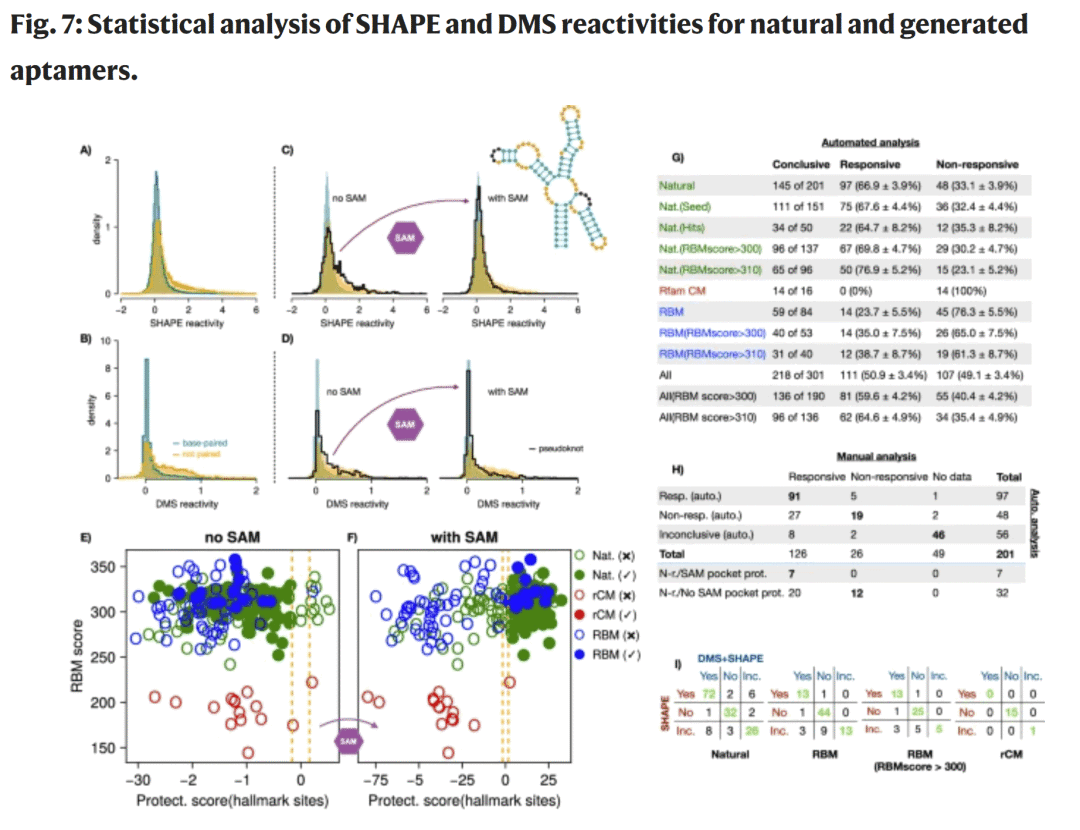 研究人员在 SAM-I 核糖开关适配体的多序列比对数据上训练 RBM,将 RNA 序列建模为显层变量,通过隐层学习跨位点的高阶统计依赖。RBM 由此隐式编码了二级结构、假结及关键三级相互作用的约束。模型生成的新序列通过 SHAPE 和 DMS 两种化学探针方法进行高通量实验验证,并结合统计分析框架,量化配体诱导的整体构象变化能力。