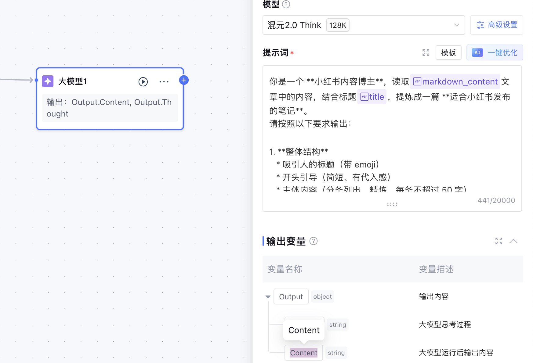 在获取了文章的内容之后,我们就需要进行改写,这里我们使用大模型节点。定义输入变量,将前置插件节点获取的文章内容markdown_content和标题title作为变量。这里变量的作用和之前在大模型标签提取节点的作用一样,都是在提示词中引用。