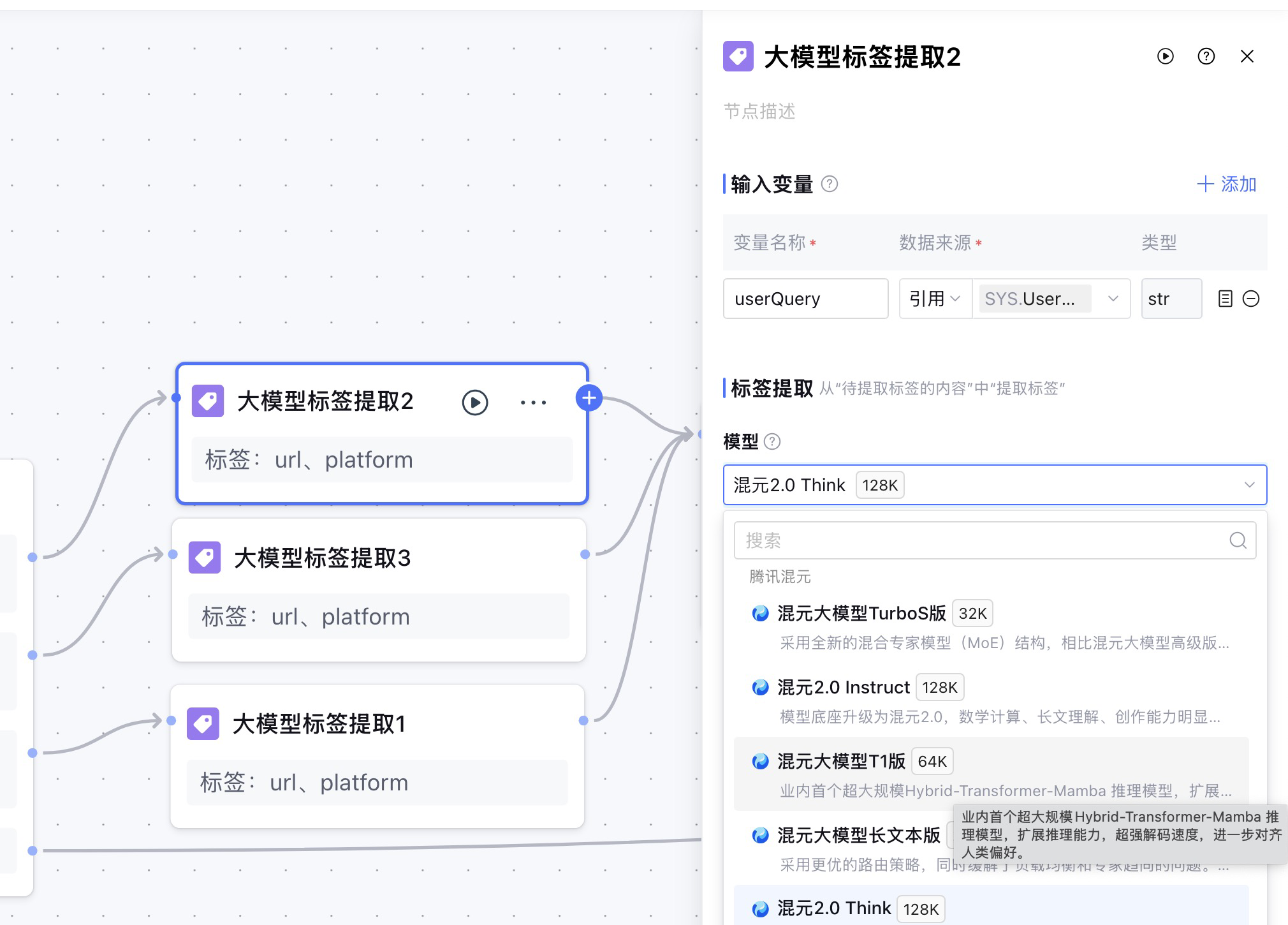 定义好变量之后我们选择大模型,这里我使用的是混元2.0 Think。