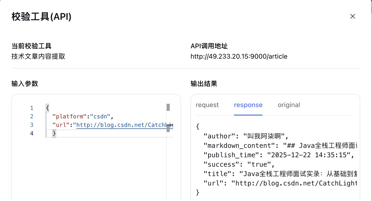 如图,成功调用了API插件,完成了技术文章信息的提取。