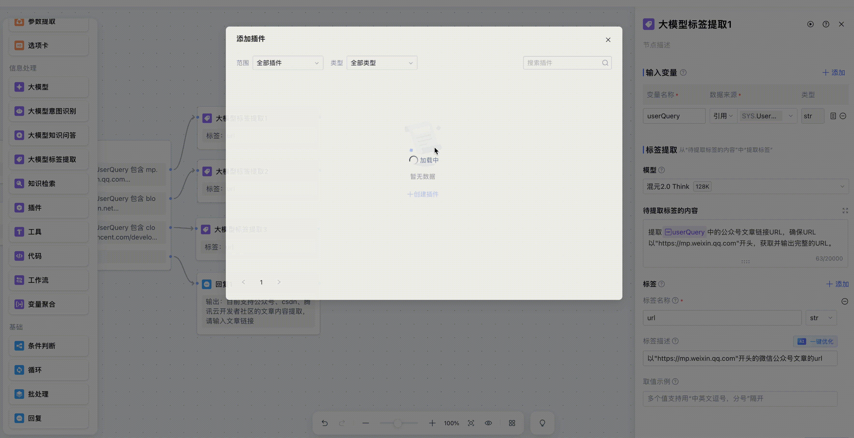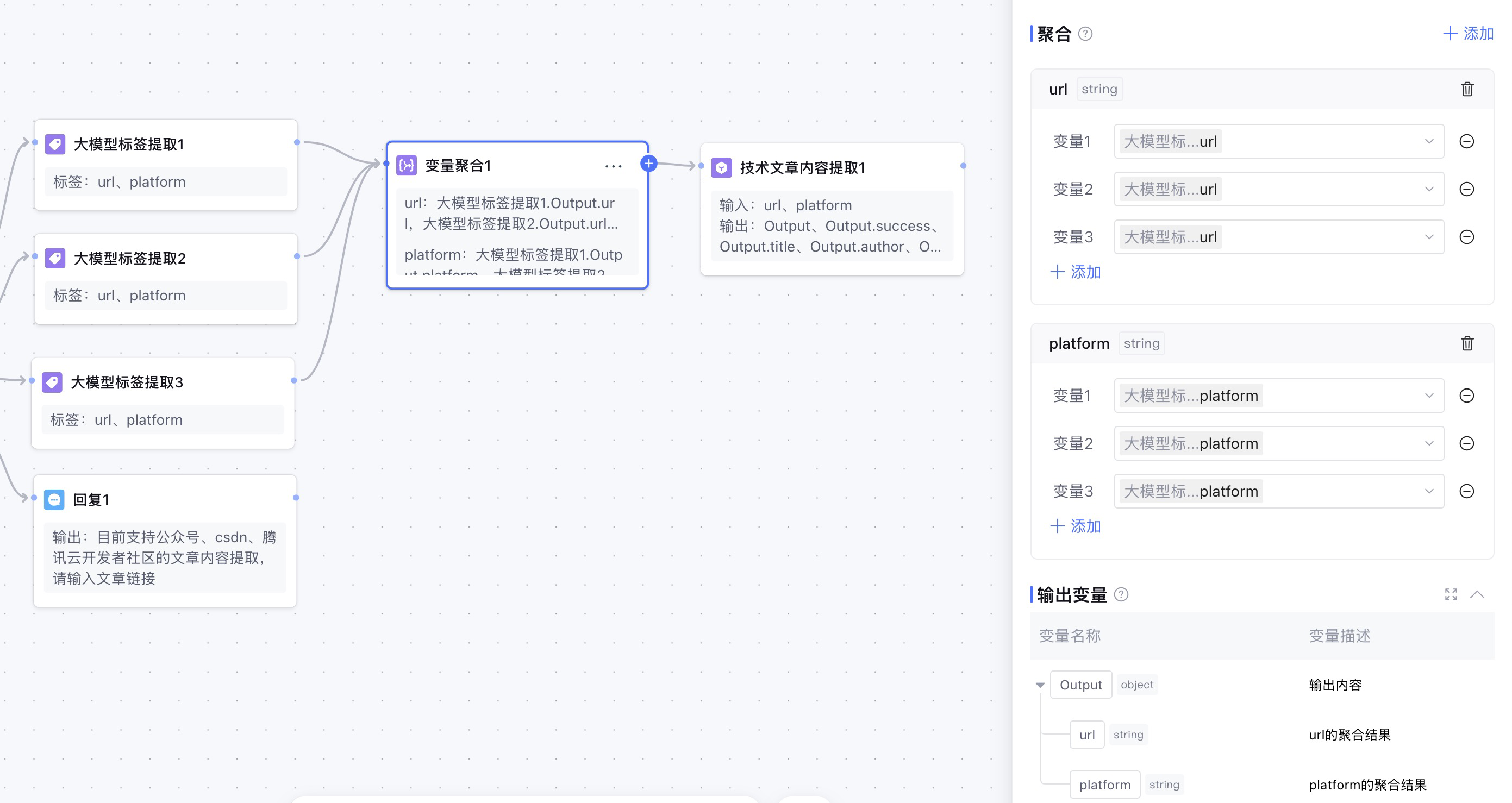 聚合时仅返回每个分组中的第一个不为空的变量,如果有多个变量有值,也仅返回第一个。所以,在大模型提取标签节点和插件节点之间,要使用变量聚合节点来做中转。