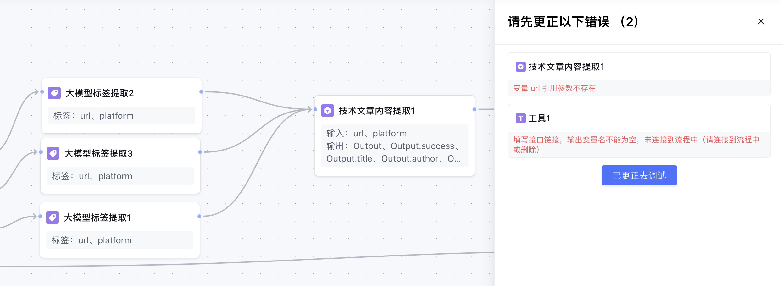 那么,是不是把前面所有的大模型提取标签节点,都连接上这个插件节点就可以,答案是否定的,这样会直接报错。