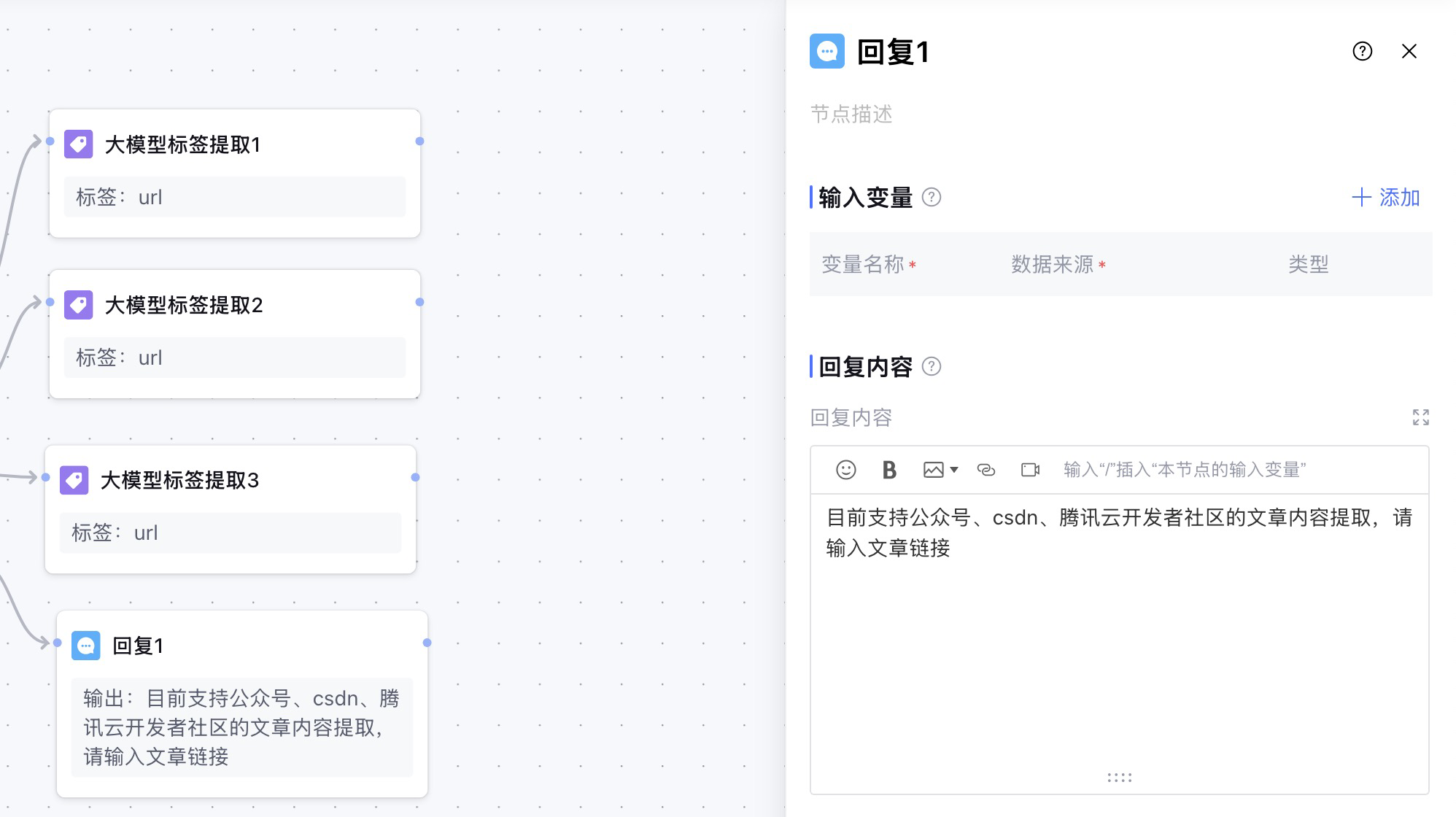 但是大模型节点是当用户输入的url中,包含微信公众号、腾讯云开发者社区、csdn的文章url时候的执行路径,而当用户输入中不包含三个平台url的时候,直接执行的是else,然后是一个回复节点,这个回复节点也是需要连接到结束节点的。