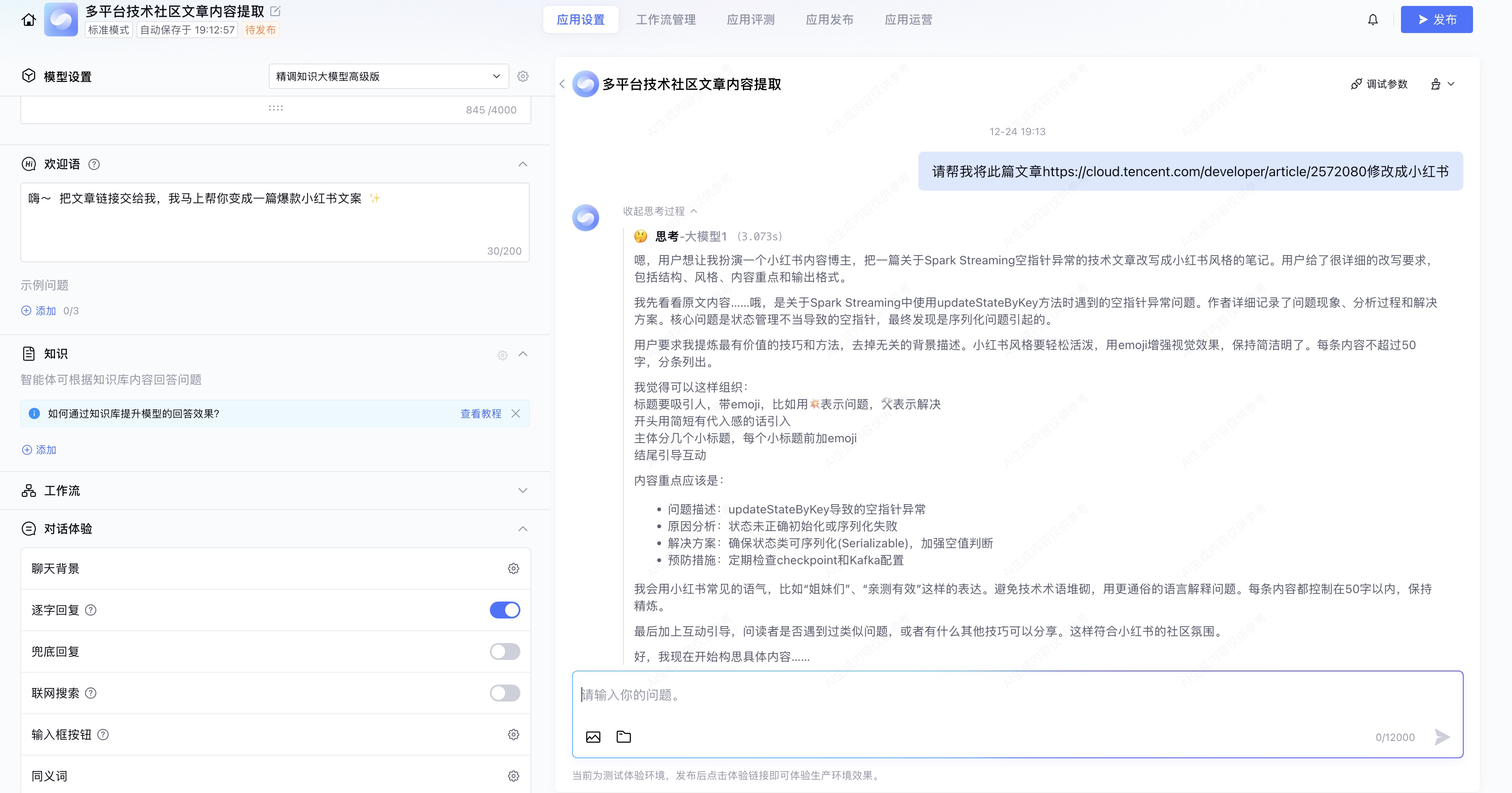 微信公众号、腾讯云开发者社区、CSDN主流技术平台文章,自动改写爆款小红书文案的智能体搭建,是基于腾讯元器实现的,元器友好简洁的操作界面,让智能体的构建、应用和发布极为简单,让入门者可以快速上手。