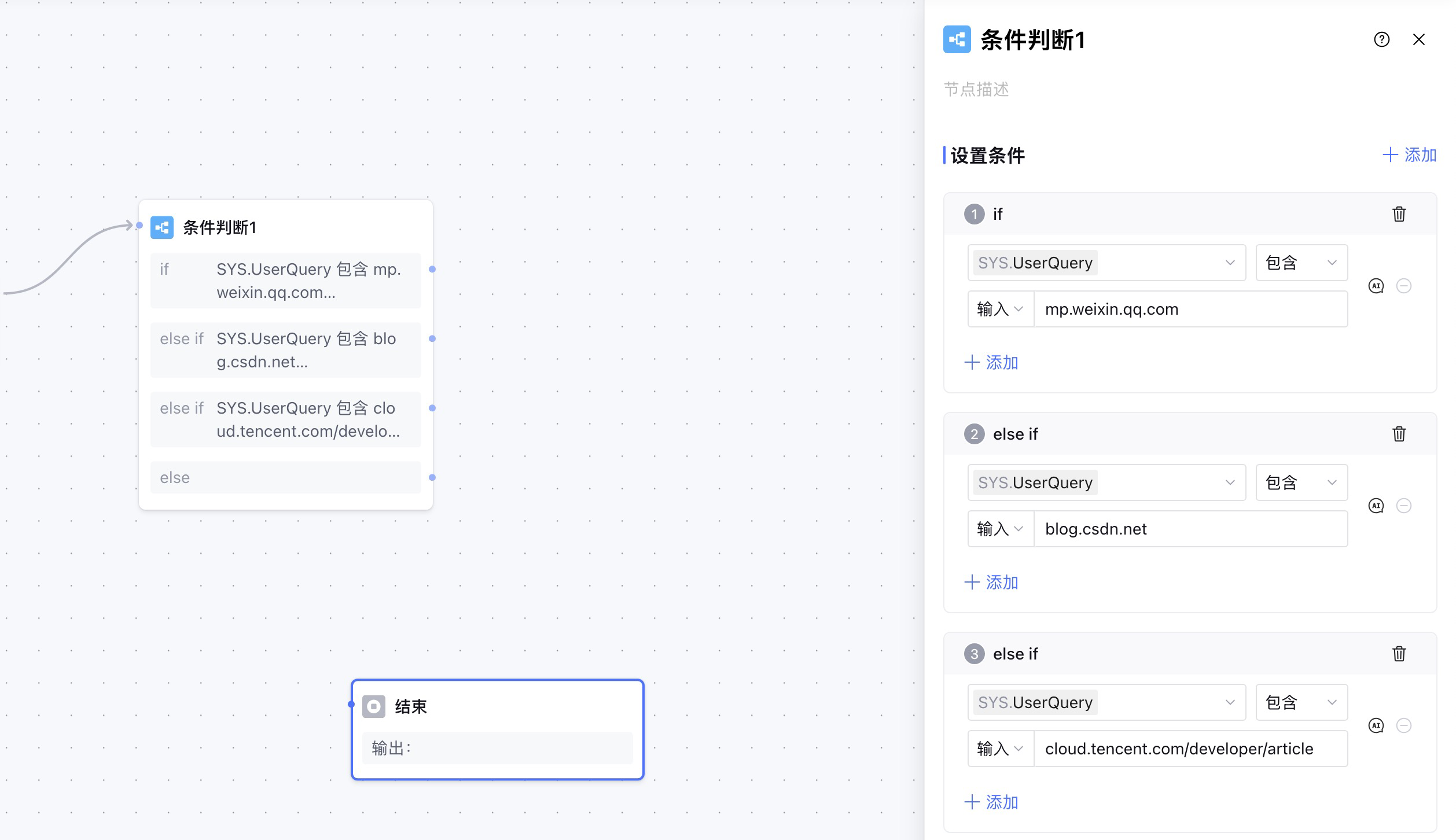 我们在条件中,使用开始节点的UserQuery变量,选择包含,在设置条件时选择输入,最后输入预设的条件。然后通过添加else if,最后完成是否包含三个技术平台的url的判断。